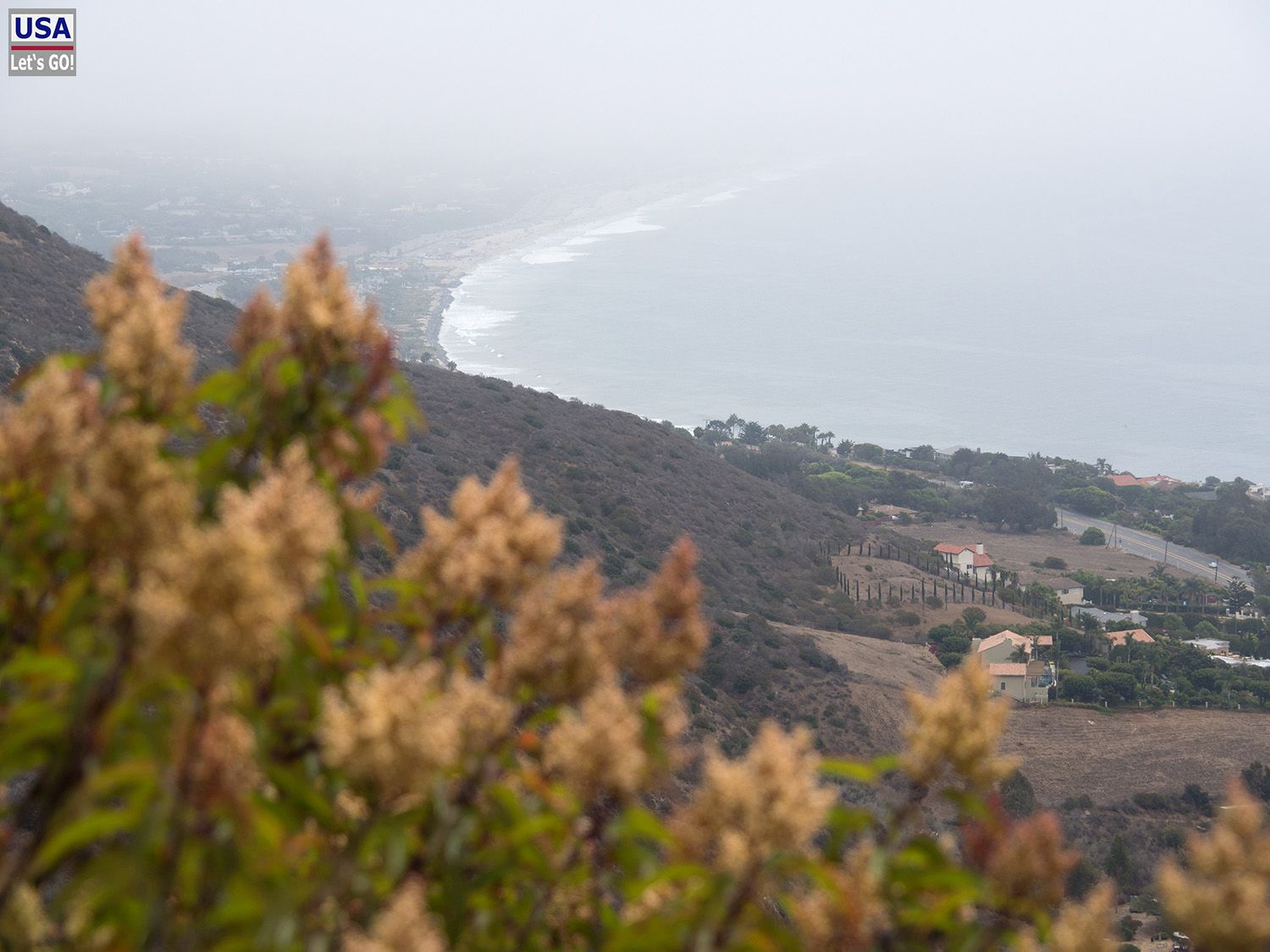 Der Westlake Boulevard trifft auf den berühmten Mulholland Drive, dem wir aber nur ein kurzes Stück folgen und stattdessen weiter über die Decker Road auf die Encinal Canyon Road kommen. Hier oben ist es gar nicht mehr heiß, sondern sogar noch ein wenig neblig. Die marine layers sind auf dem Sprung sich zu verziehen, wir sind quasi an der Grenze zwischen blauem Himmel und Waschküche. Wir machen eine kurze Pause und blicken auf den Pazifik, der seine typische tintenblaue Färbung noch nicht angenommen hat.