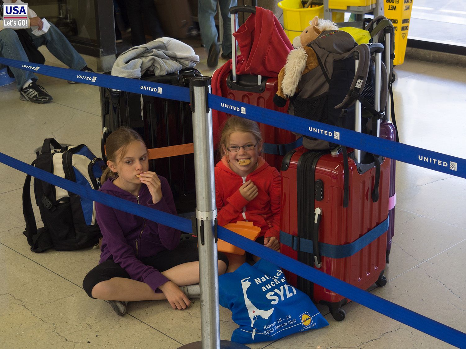 Sicherheitshalber fragt Anja eine United-Mitarbeiterin, ob wir hier richtig sind und uns wirklich anstellen müssen. Ich bleibe in der Zwischenzeit mit den Kindern beim Gepäck und reihe mich prophylaktisch schon mal ein.
