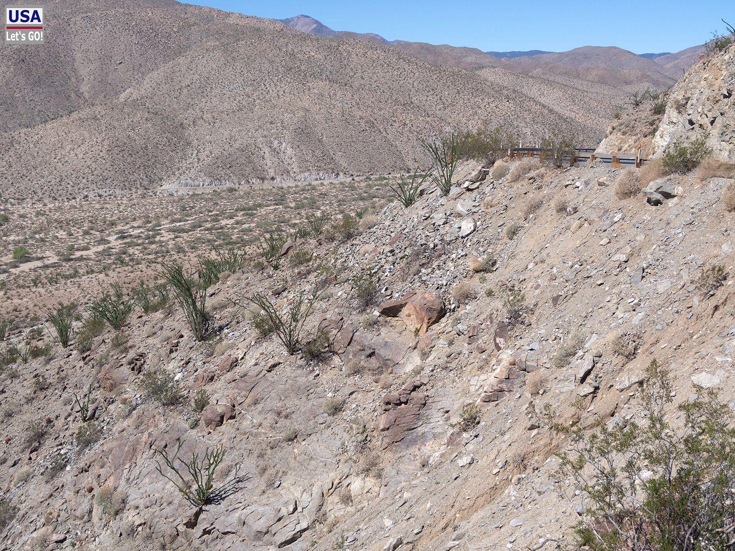 Über kleinere Straßen (S 3) fahre ich nach Borrego Springs. Dabei überquere ich den Yaqui Pass, wo ich kurz anhalte um einige Fotos von der trostlosen, für mich aber faszinierenden, Landschaft zu machen. Die kargen Vallecito Mountains türmen sich im Hintergrund wie riesige Wellenbrecher auf.