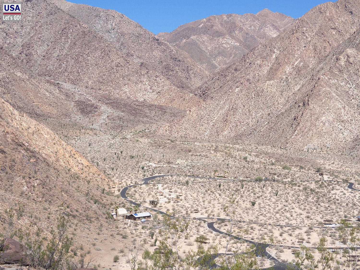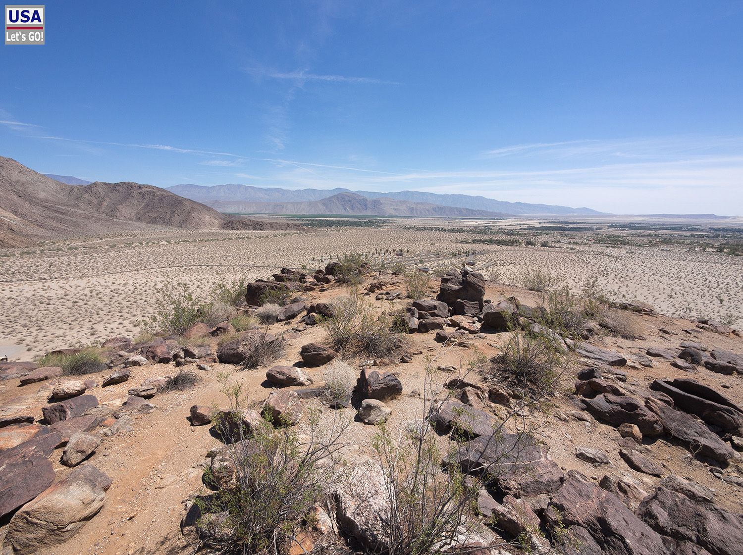 Auf der anderen Seite erstreckt sich das einem Glutofen gleichende Borrego Valley. Platt wie eine Flunder liegt es inmitten der Wüste und auch Borrego Springs befindet sich in diesem öden Tal. Die Santa Rosa Mountains im Hintergrund flimmern in der Hitze.