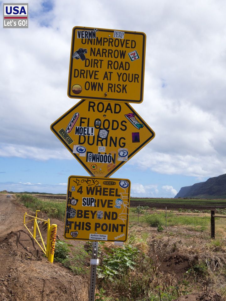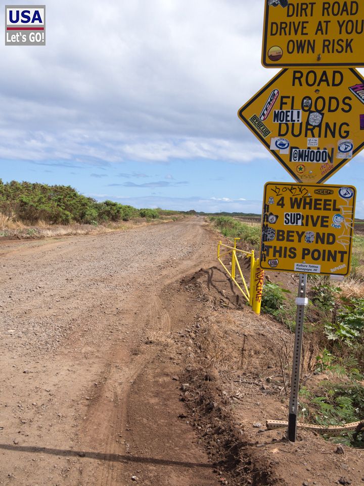 Um dorthin zu kommen muss man zum Schluss eine etwa fünf Meilen lange dirt road fahren, vor der vor allem im Interesse der Mietwagenfirmen massiv gewarnt wird.