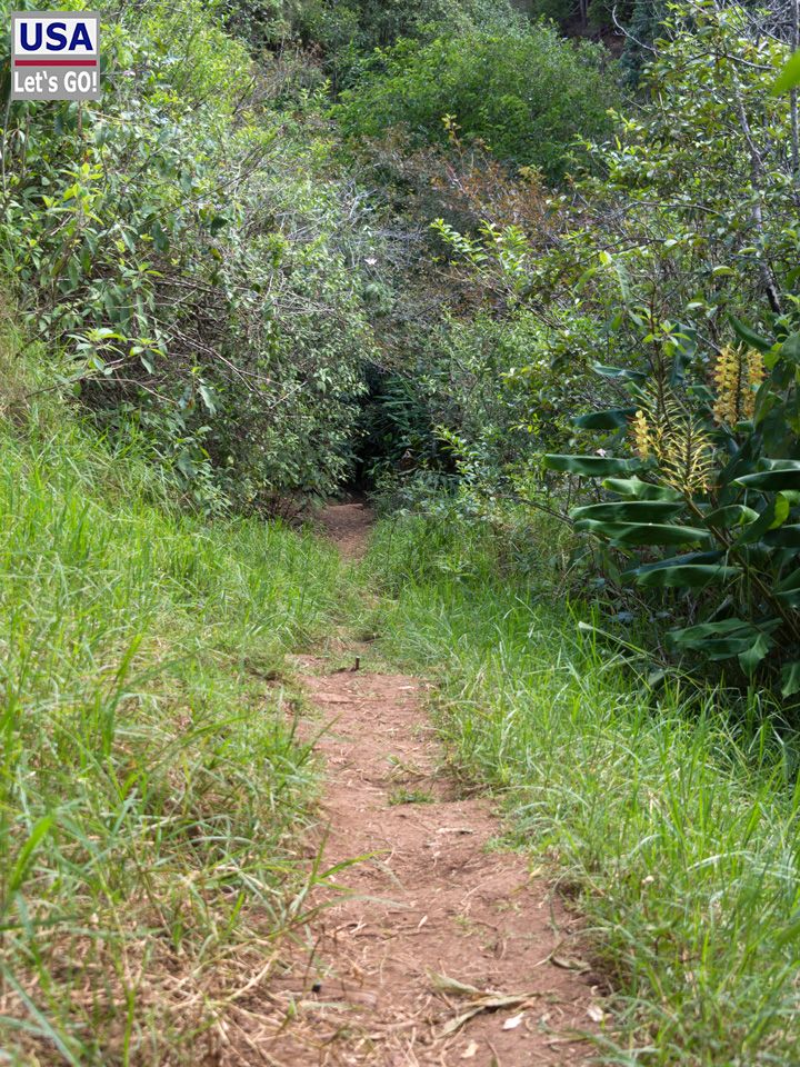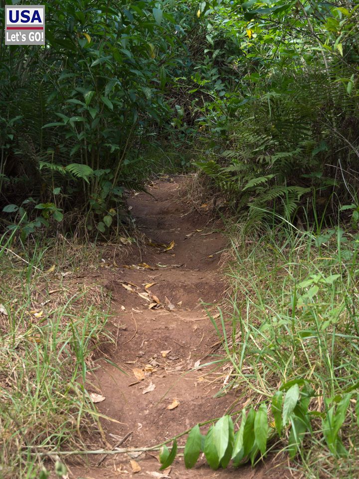 Ich möchte hier den Canyon Trail wandern, während Anja und die Kinder auf mich warten. Mit reichlich Wasser bewaffnet mache ich mich auf den Weg, der zunächst flach durch dichten Urwald verläuft, um nach kurzer Zeit steil abzufallen. Wenn es hier glitschig ist, kann man ganz hervorragend ins Rutschen geraten.