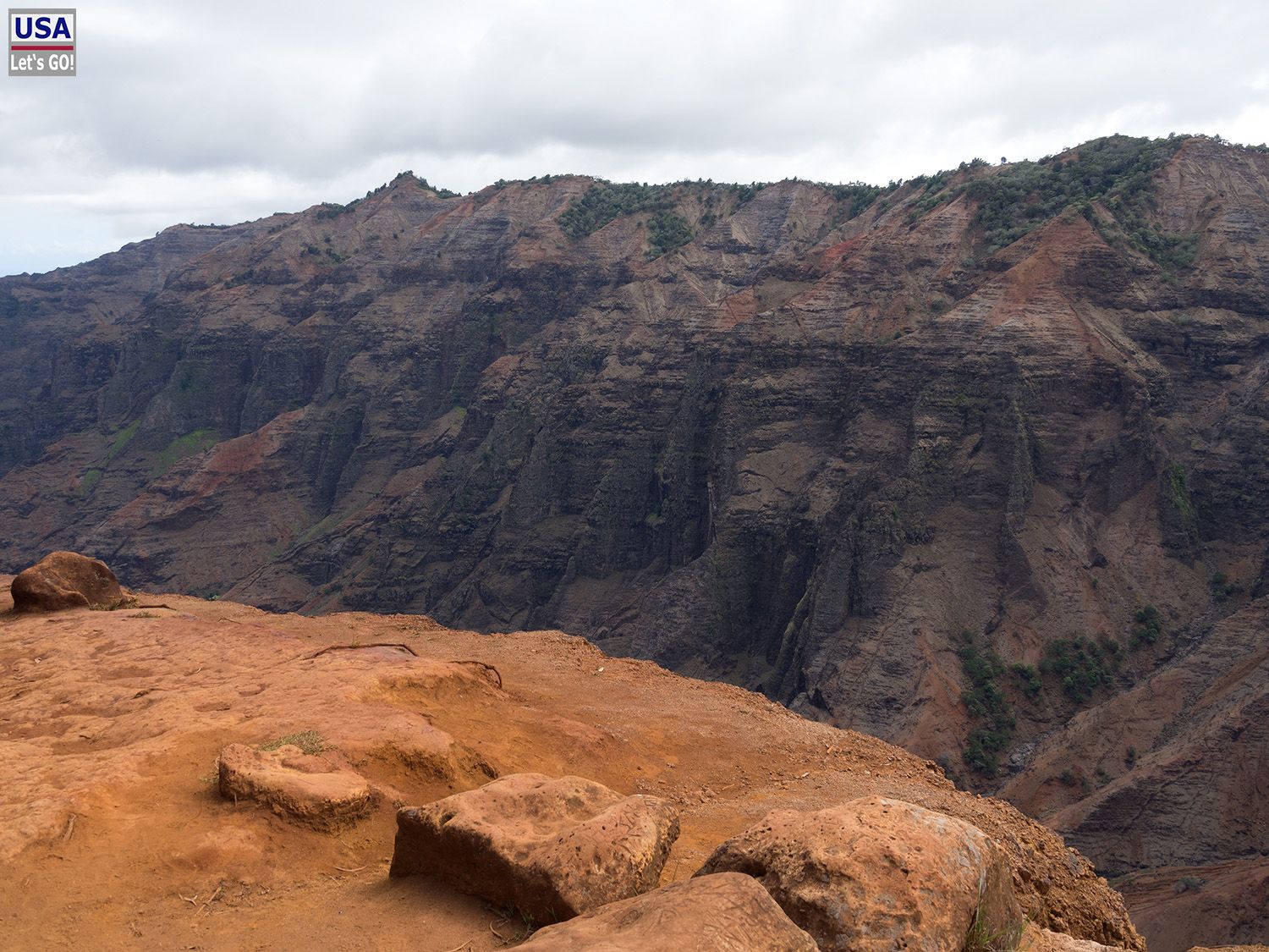 Anschließend nehmen wir den Waimea Canyon Drive um zum gleichnamigen Canyon zu fahren. Schon die Anfahrt über die gewundene schmale Straße ist klasse und unterwegs bieten sich immer wieder schöne Fotostopps an. Soll noch einer sagen, rote Erde gäbe es nur im Südwesten.