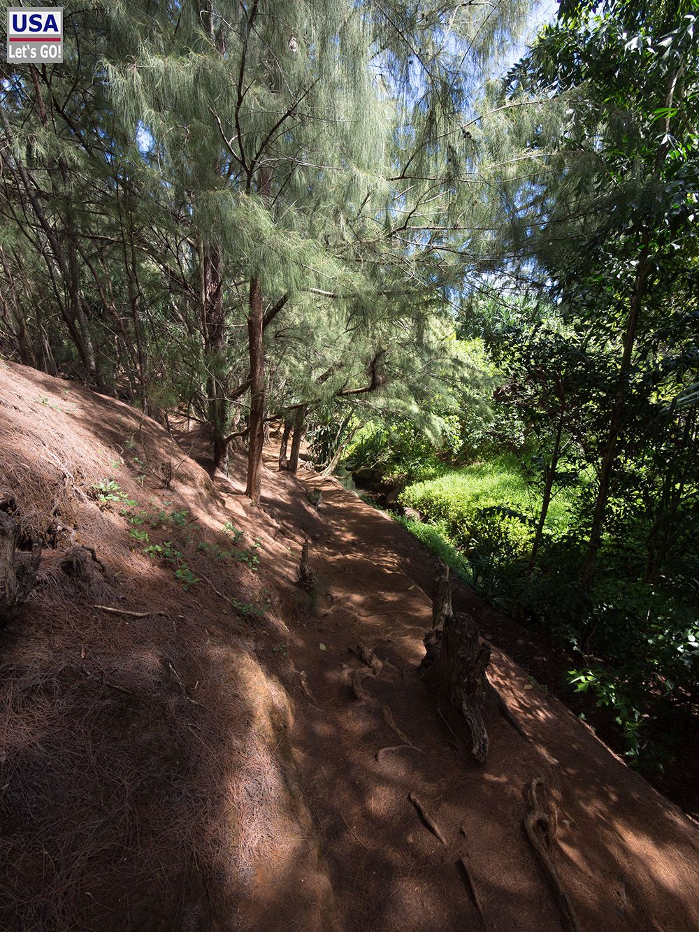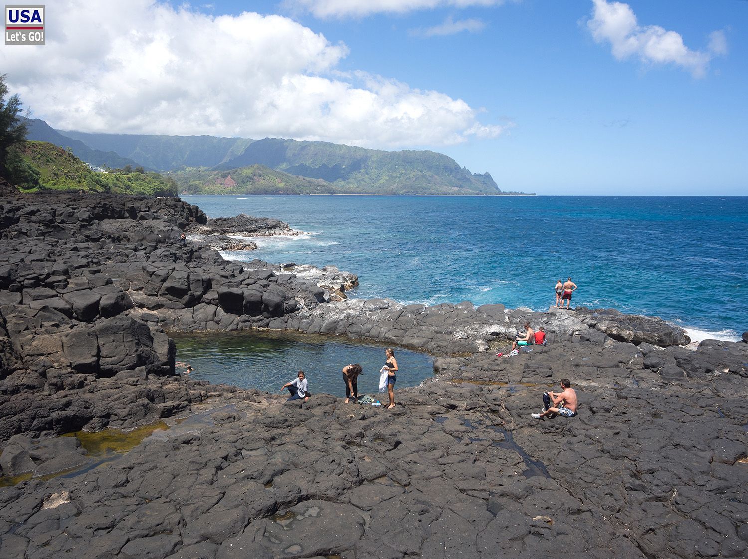 Weiter geht´s Richtung Norden und nach einer Weile erreichen wir Princeville. Kurz hinter dem mondänen Prince Golf Course biegen wir rechts ab und folgen der Ka Haku Road und schließlich erreichen wir den kleinen Parkplatz am Ende der Punahele Road, von dem aus der trail zu Queen`s Bath losgeht.
