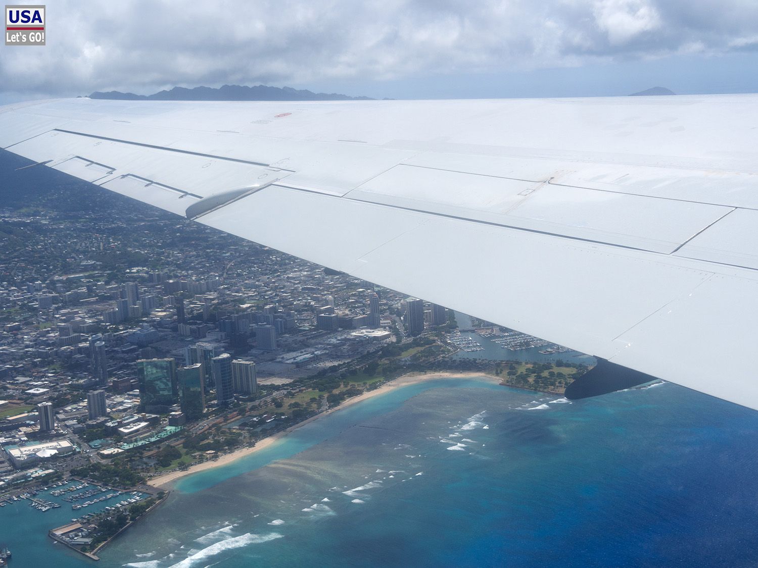 Nach einer Weile kommen die anderen Fluggäste und nach den üblichen Sicherheitseinweisungen geht es zügig los. Dieses Mal sitze ich auf der richtigen Seite und kann Honolulu von oben fotografieren.