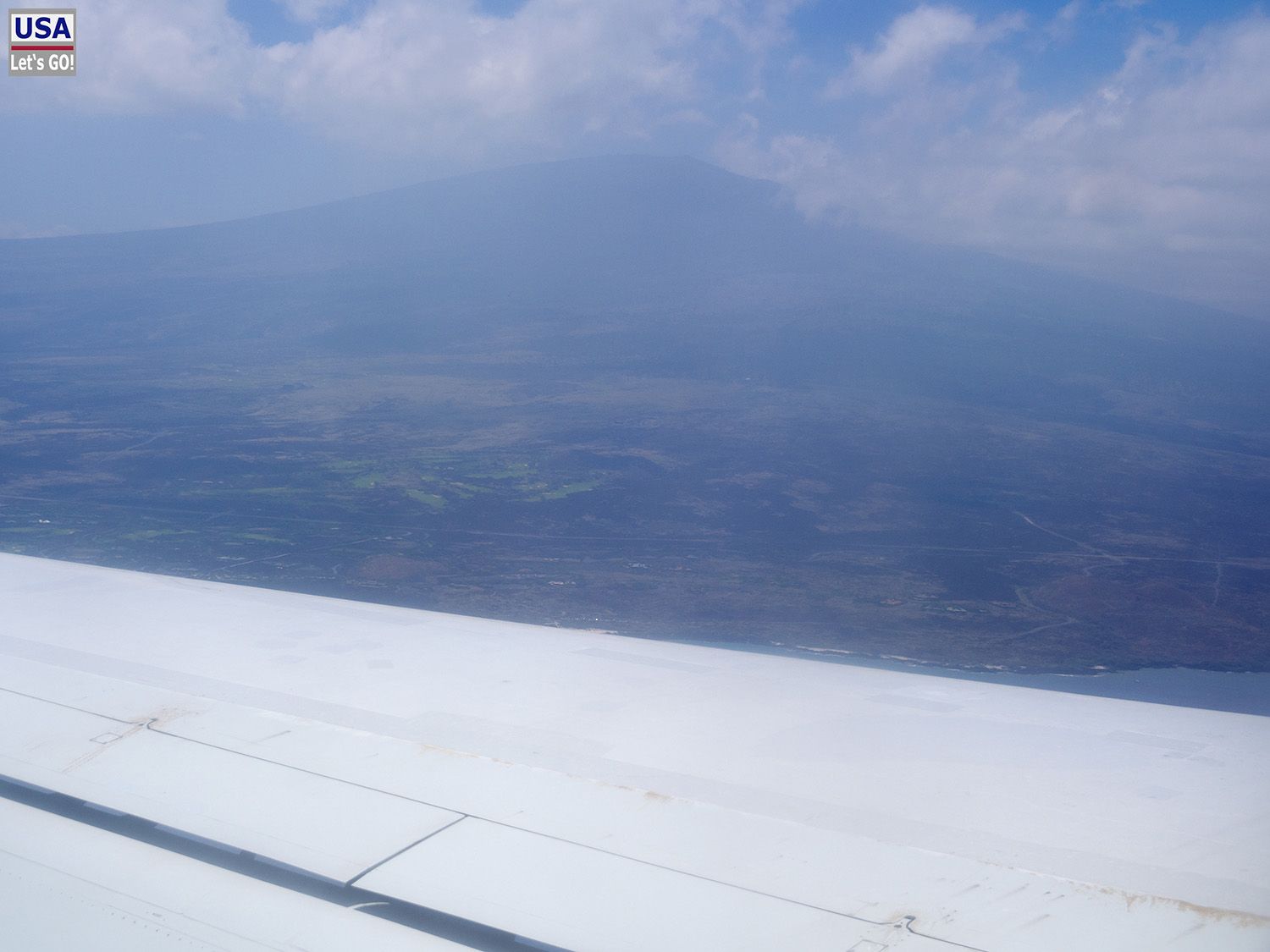 Beim Landeanflug nach Kona liegt der Mauna Loa zur Linken. Es ist sehr diesig, die Sonne scheint nur halb und Big Island sieht von oben wenig einladend aus. Allerdings sehen wir etwas weiter im Norden auch schon einige schöne Buchten mit Palmen und Sandstränden. Gleich mal eine Gedankennotiz machen, dass wir da hin müssen.