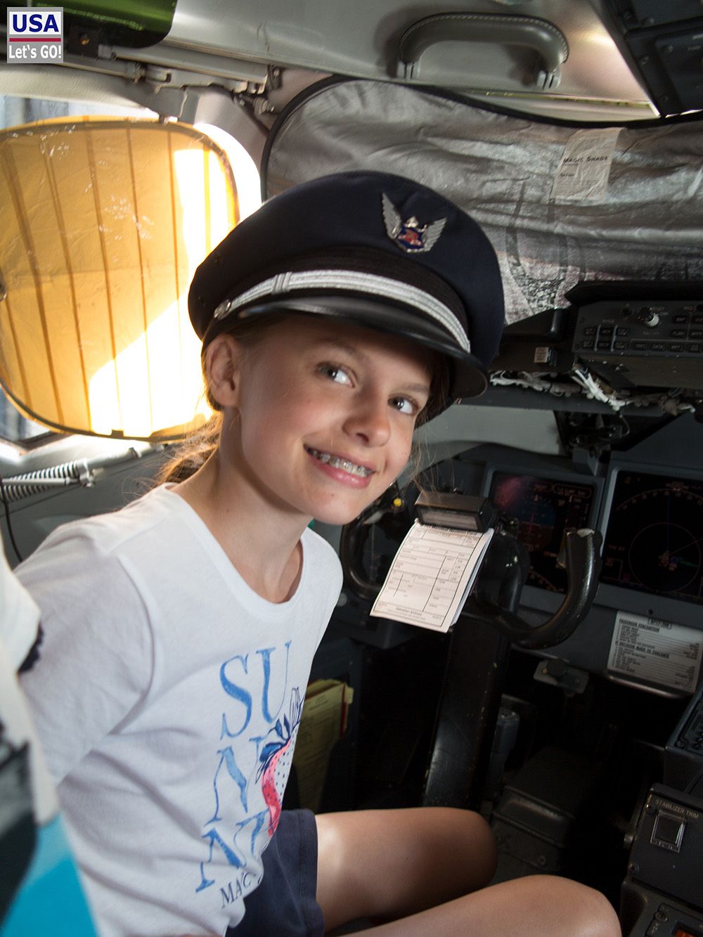 Auch der Copilot bleibt an Bord und Lisa-Marie und Annalena dürfen ins Cockpit gehen und sich die ganzen Geräte und Anzeigen anschauen. Der Mann heißt Jeff, kommt aus Chicago und ist total nett. Beide Mädchen bekommen sogar die Pilotenmütze auf den Kopf, dürfen diverse Knöpfe ausprobieren und das Steuerrad bedienen.