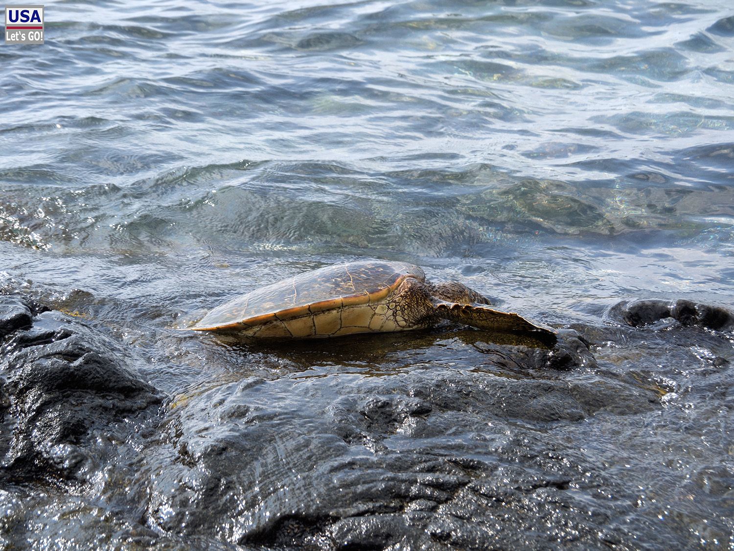 Anders. Der Kahalu'u Beach jedenfalls ist ganz anders als die Strände auf Kaua'i. Hier gibt es keinen goldgelben Sandstrand, sondern graubraunen bis anthrazitschwarzen Lava-Sand. Das sieht auf den ersten Blick sehr gewöhnungsbedürftig aus und hätten wir nicht durch entsprechende Recherchen gewusst, was uns erwartet, wäre die Überraschung groß gewesen.