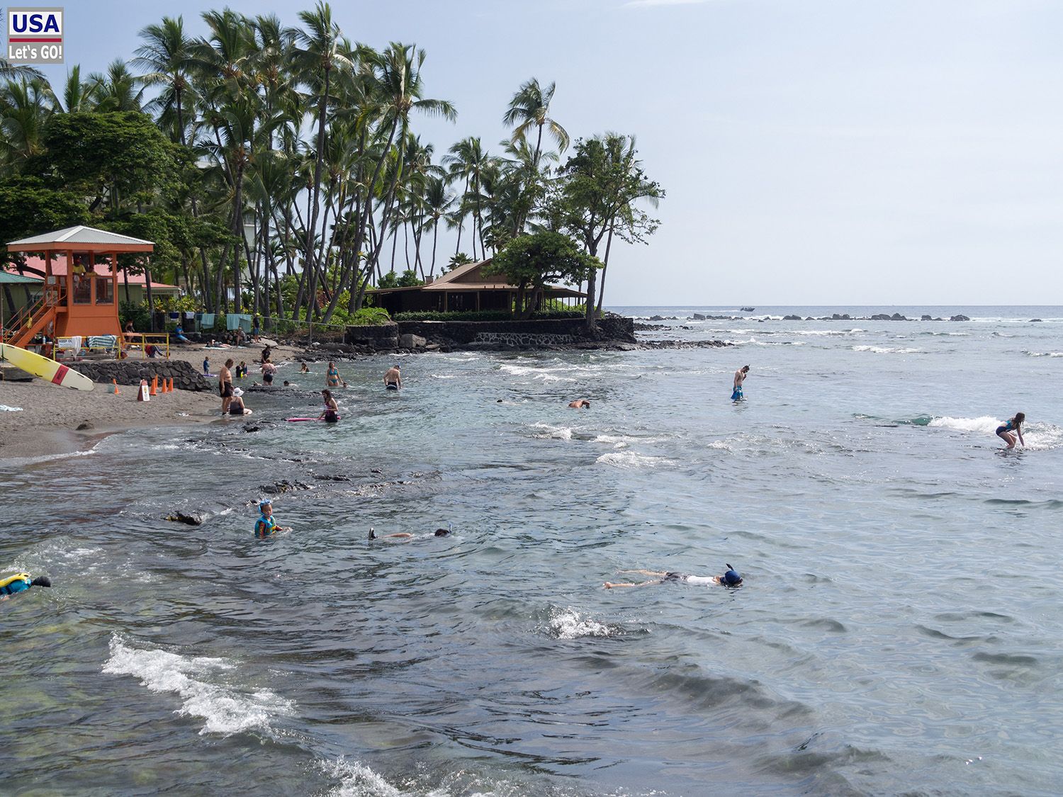 Nachdem wir unser Gepäck in die Wohnung verfrachtet und ausgeräumt und ein wenig relaxt haben, fahren wir zum Kahalu'u Beach Park, der ganz in der Nähe ist. Mal sehen, wie die Strände auf Big Island sind.