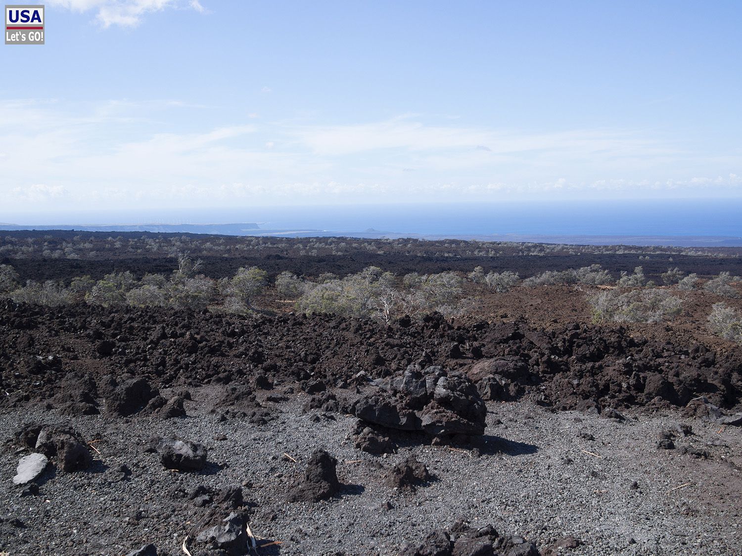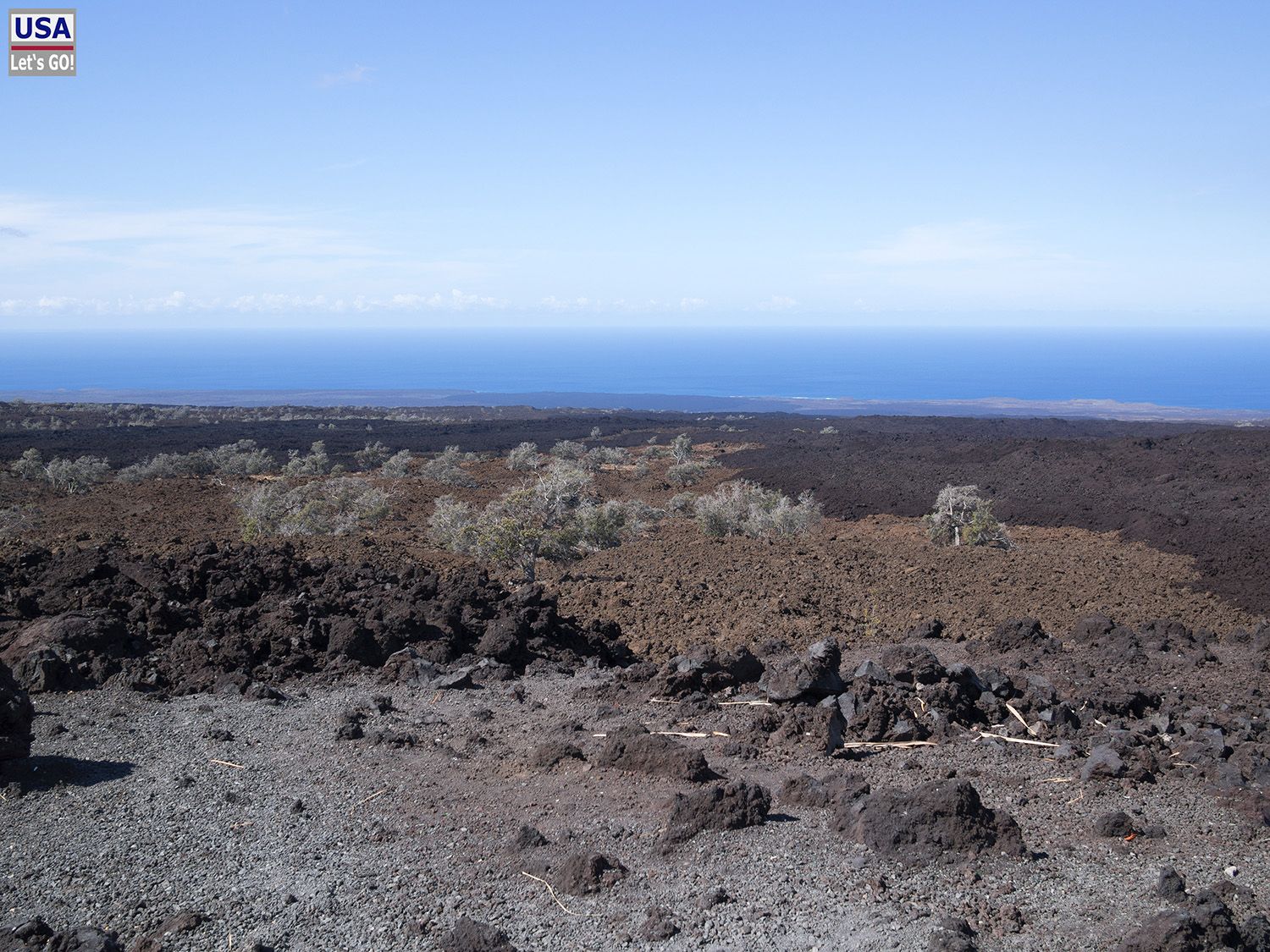 Überall karge Lava-Badlands und in der Ferne, deutlich tiefer gelegen, der stahlblaue Pazifik.