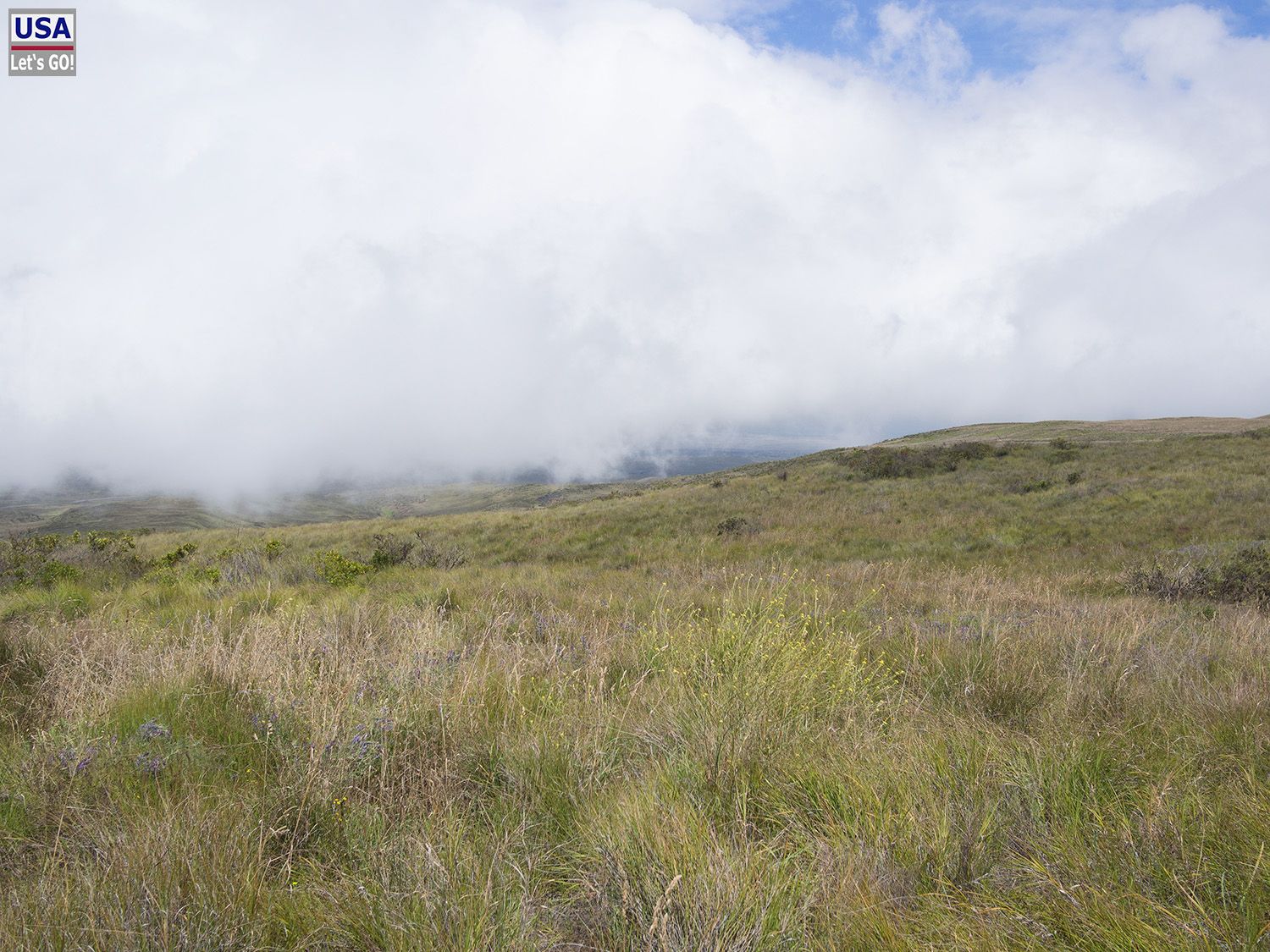 Kurz danach biegen wir links ab auf die Mauna Kea Access Road. Die Straße ist zu Beginn an den Rändern etwas holprig, sodass es nicht verwunderlich ist, dass die meisten Autofahrer mitten auf der Straße fahren. Die Streckenbeschaffenheit bessert sich nach kurzer Zeit und die Mauna Kea Access Road führt auf und ab durch die Ausläufer des riesigen Bergmassivs vor uns, dessen Gipfel aber von Wolken verhüllt ist.