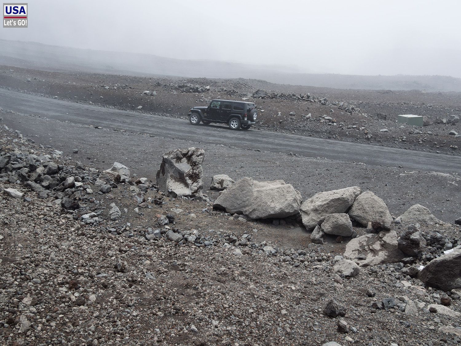 Ferner wird empfohlen nur mit echtem 4WD die nicht-asphaltierte Straße zum Gipfel in Angriff zu nehmen. Unser Jeep ist da natürlich das richtige Fahrzeug. In der Tat, die Straße ist sehr steil und der gravel stellenweise ein wenig rutschig, was sich in manchen Passagen mit etwas washboard bemerkbar macht. Der Jeep tanzt manchmal ein wenig hin und her, so als würde er mit dem Hinterteil hin und her wackeln. Fishtailing nennen die Amerikaner so ein Fahrverhalten. Ich fahre deshalb sehr vorsichtig.
