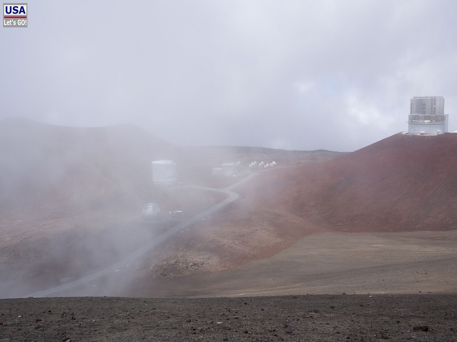 Im Nebel tauchen die futuristisch aussehenden Gebäude des Mauna Kea Observatory auf. In den dichten Schwaden sehen sie aus wie Mondbasis Alpha 1 aus einem Science Fiction Film.