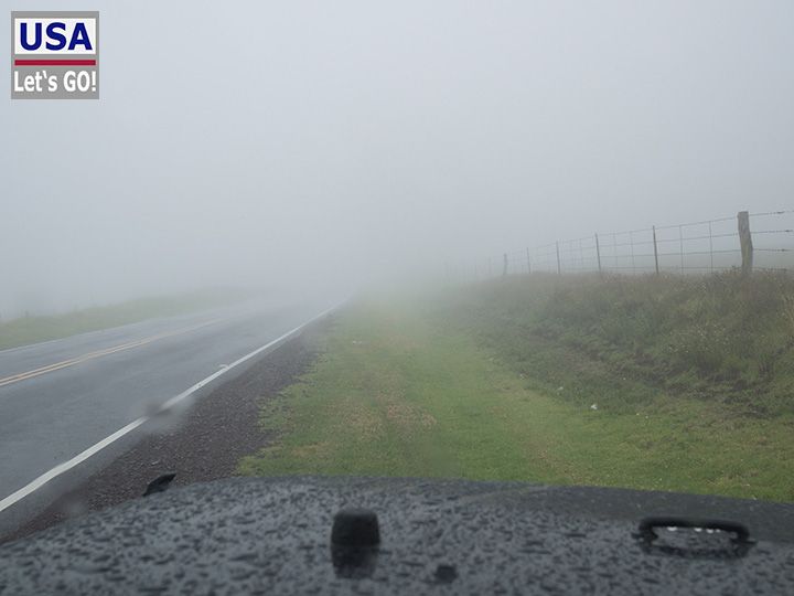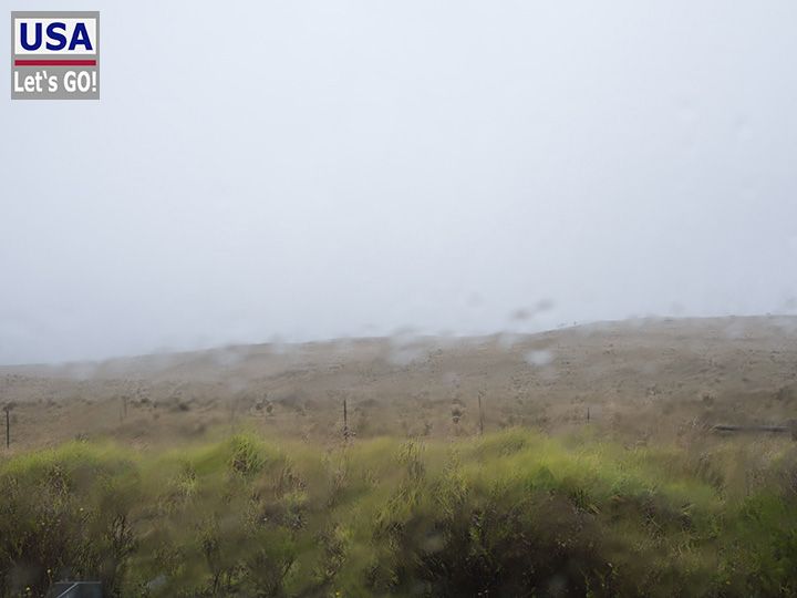 Das Wetter bzw. die Sicht ändern sich jetzt minütlich. Mal ist es klar, mal totale Waschküche. Plötzlich klart es auf und das sogar für länger als ein paar Minuten. Ich mache schnell ein Video von der dirt road, die um die Gebäude des Observatoriums führt. (Das ist nicht die Maua Kea Access Road.) Die GoPro befestige ich zu diesem Zweck mit einem starken Saugnapf auf der Kühlerhaube. Sicherheitshalber binde ich sie noch an den Scheibenwischerhalterungen fest.