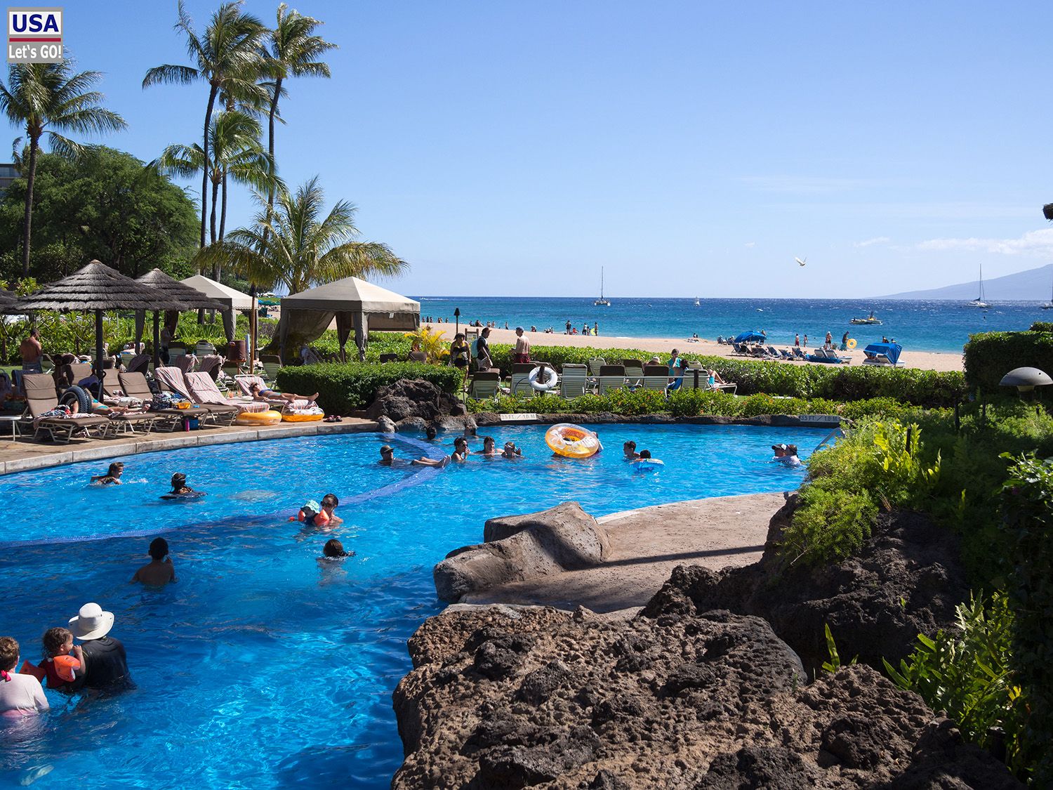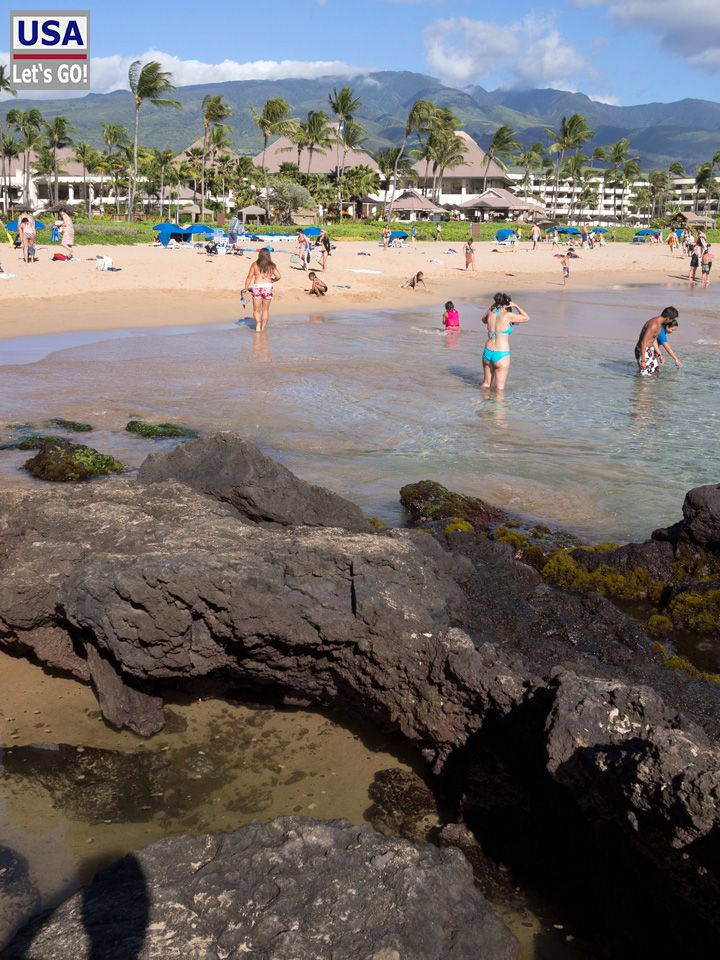 Erst am Black Rock halten wir wieder an. Der Black Rock trennt den Kehekili Beach Park im Norden von dem Ka'anapali Beach im Süden. Wir suchen einen Parkplatz und landen auf dem Parkplatz vom Sheraton Hotel. Stehen bleiben können wir hier nicht, aber ein Foto vom Kehekili Beach ist doch wohl drin.