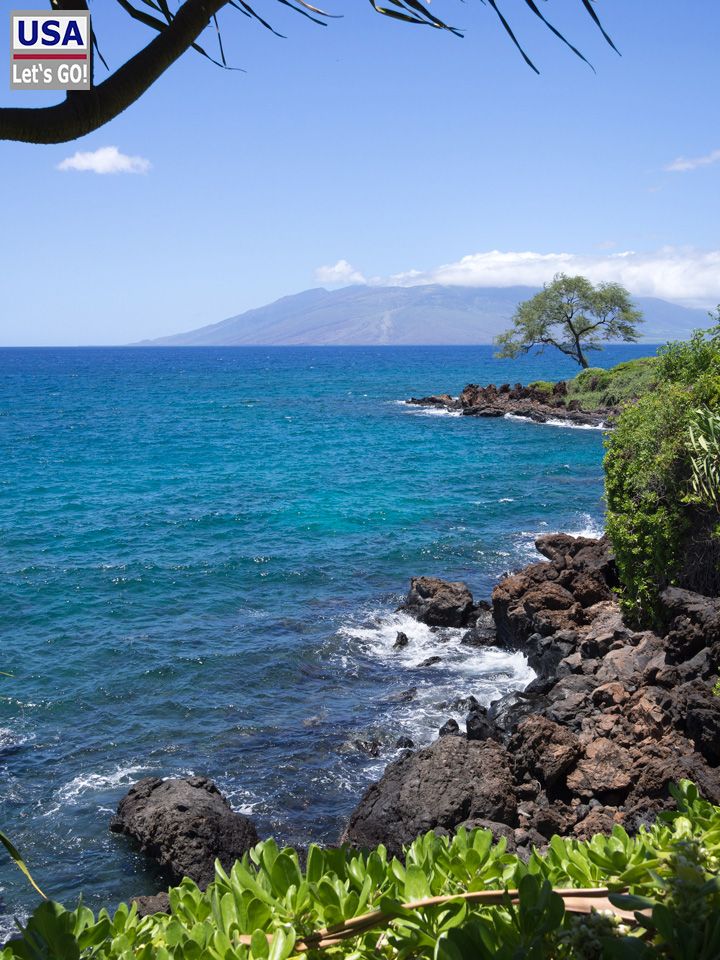 In der Mittagshitze ist es verflixt warm und auf dem Rückweg freue ich mich auf ein kühles Bad im Meer. Noch ein Blick auf den Polo Beach von der Nordseite aus. (Wo die großen Felsbrocken am Strand liegen, ist unser Platz. Schön viel Schatten - klasse!) Im Hintergrund sieht man die unbewohnte Insel Kaho'olawe.
