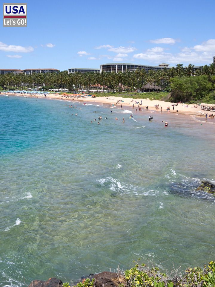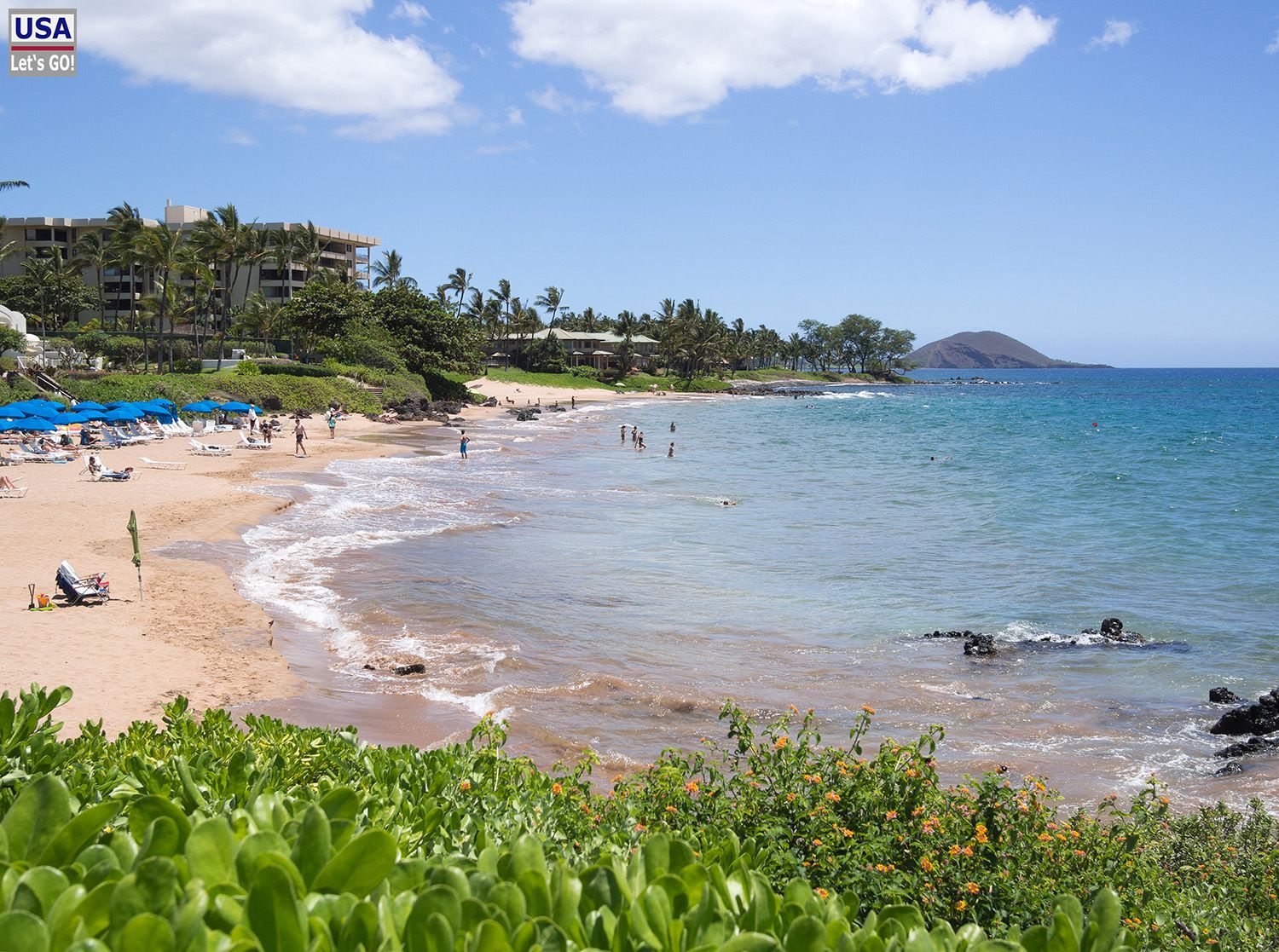Unterwegs gibt es immer wieder schöne Ausblicke auf West Maui (s. Bild links). Nach ca. einer halben Stunde bin ich beim Wailea Beach (s. Bild rechts) und kehre um.