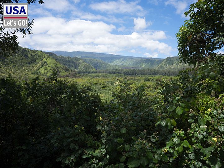 Ein kurzer Weg mit Treppenstufen führt bergan zu einem schönen Aussichtspunkt. Auf der einen Seite sieht man die Nordküste mit der kleinen Ortschaft Wailua und ihren Tarofeldern (s. Bild links). Auf der anderen, der mauka-Seite geht der Blick über den Dschungel im Hinterland (S. Bild rechts).