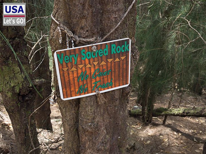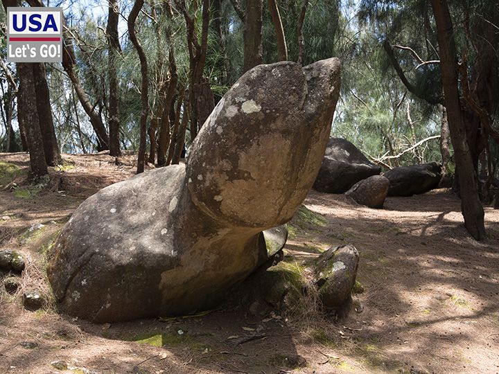 Ich kehre zum Auto zurück und fahre los, als mir einfällt, dass ich ja eigentlich noch den Phallic Rock besuchen wollte. Dieser in der hawaiianischen Tradition heilige Fels befindet sich ebenfalls im Palaau State Park. Also kehre ich um und gehe den kurzen Weg, der am Ende relativ steil bergauf führt. Plötzlich steht man vor einem Fels, der entfernt an einen ... nun ja, man sehe selbst, erinnert. Der Name lässt tief blicken...