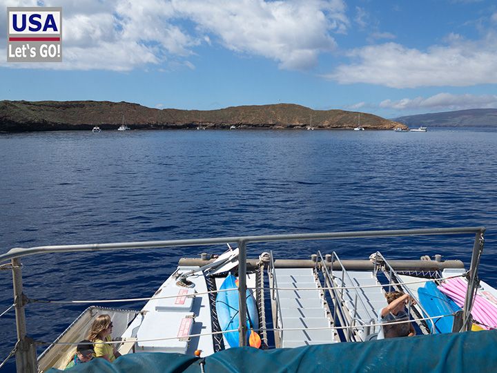 Während ein Crew-Mitglied auf großen Tafeln zeigt, welche Meeresbewohner man vor Molokini u.U. sieht, kommt der kleine versunkene Vulkan immer näher. Wir sind fast da.