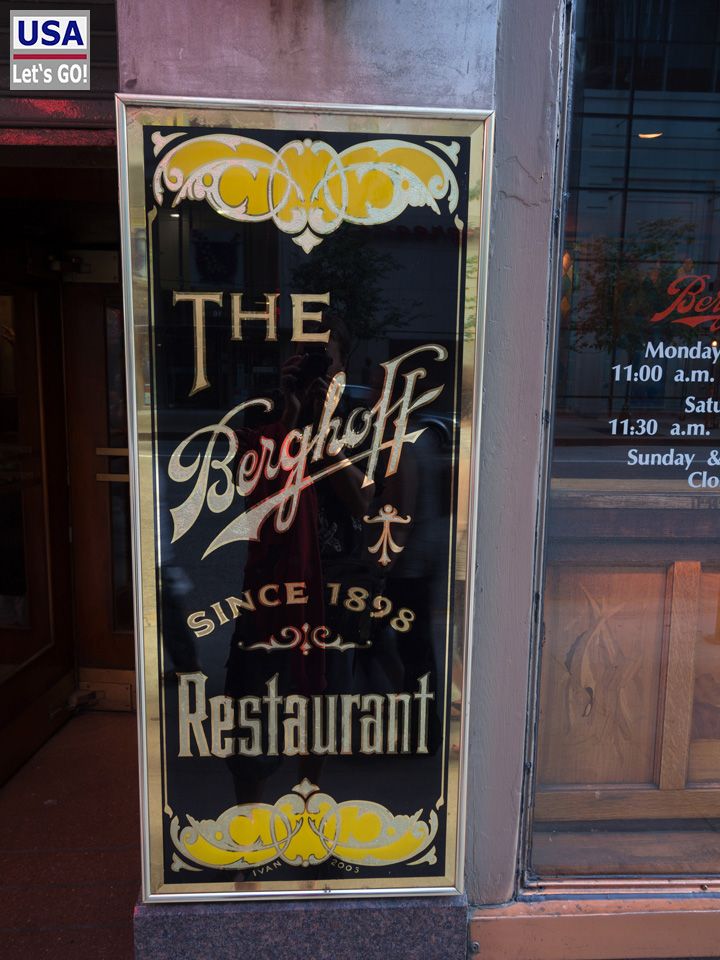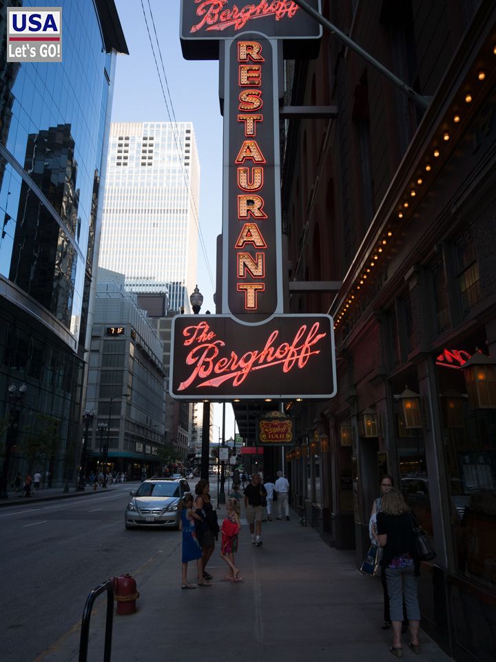 Gegen Abend haben wir etwas Besonderes vor. Wir möchten zum berühmten Berghoff`s und dort ein klassisches deutsches Abendessen verkosten. Das Berghoff´s ist ein Traditions-Restaurant an der Adams Street. 1992 waren Anja und ich dort schon einmal und haben den Laden in guter Erinnerung behalten. Damals mussten wir eine geschlagene Stunde warten, bis wir einen Tisch bekommen haben.