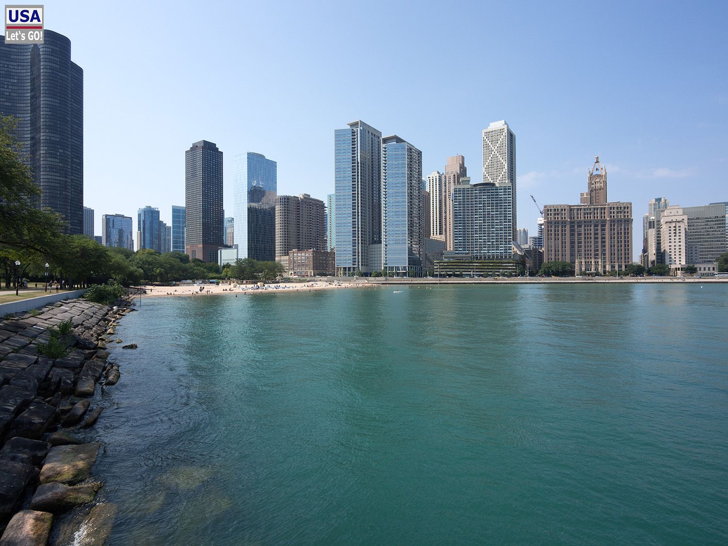 Da unser Flug erst gegen 18.00 startet, haben wir noch genügend Zeit für ein paar Besichtigungen. Im Bistro des Essex Inn holen wir uns ein paar Croissants auf die Hand und fahren dann mit dem Shuttle los. Wieder lassen wir uns am Navy Pier absetzen. Aber diesmal gehen wir rüber zum Milton Lee Olive Park, von wo aus man einen schönen Blick über den Lake Michigan auf Downtown hat.