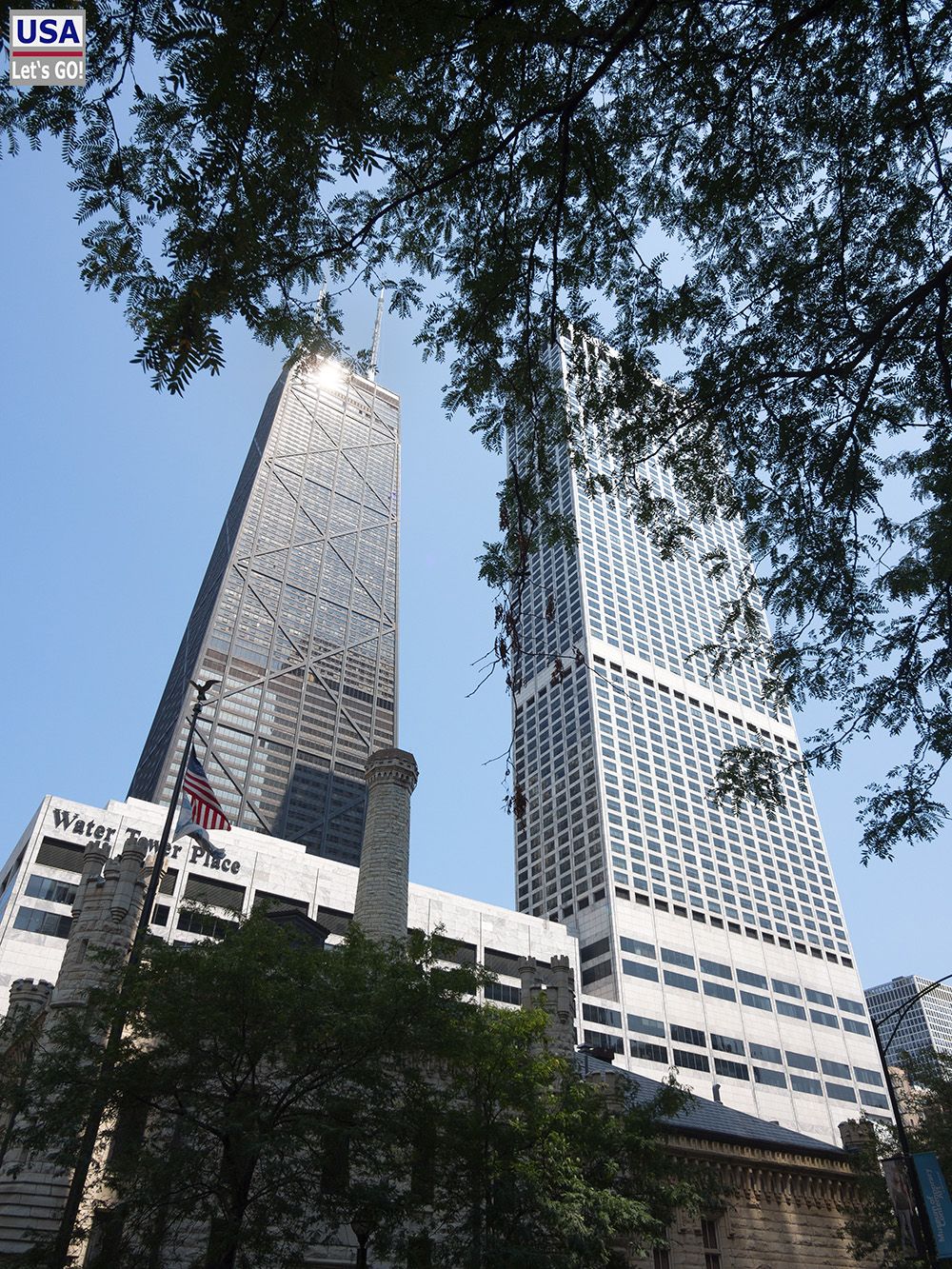 Von hier gehen wir zum John Hancock Center. Laut Karte ist das nur ein Katzensprung, aber der Weg zieht sich ganz schön. Anja und ich waren schon mal oben, sodass wir darauf heute verzichten und uns damit begnügen die Köpfe in den Nacken zu legen und nach oben zu starren. Ganz schön hoch das Teil.