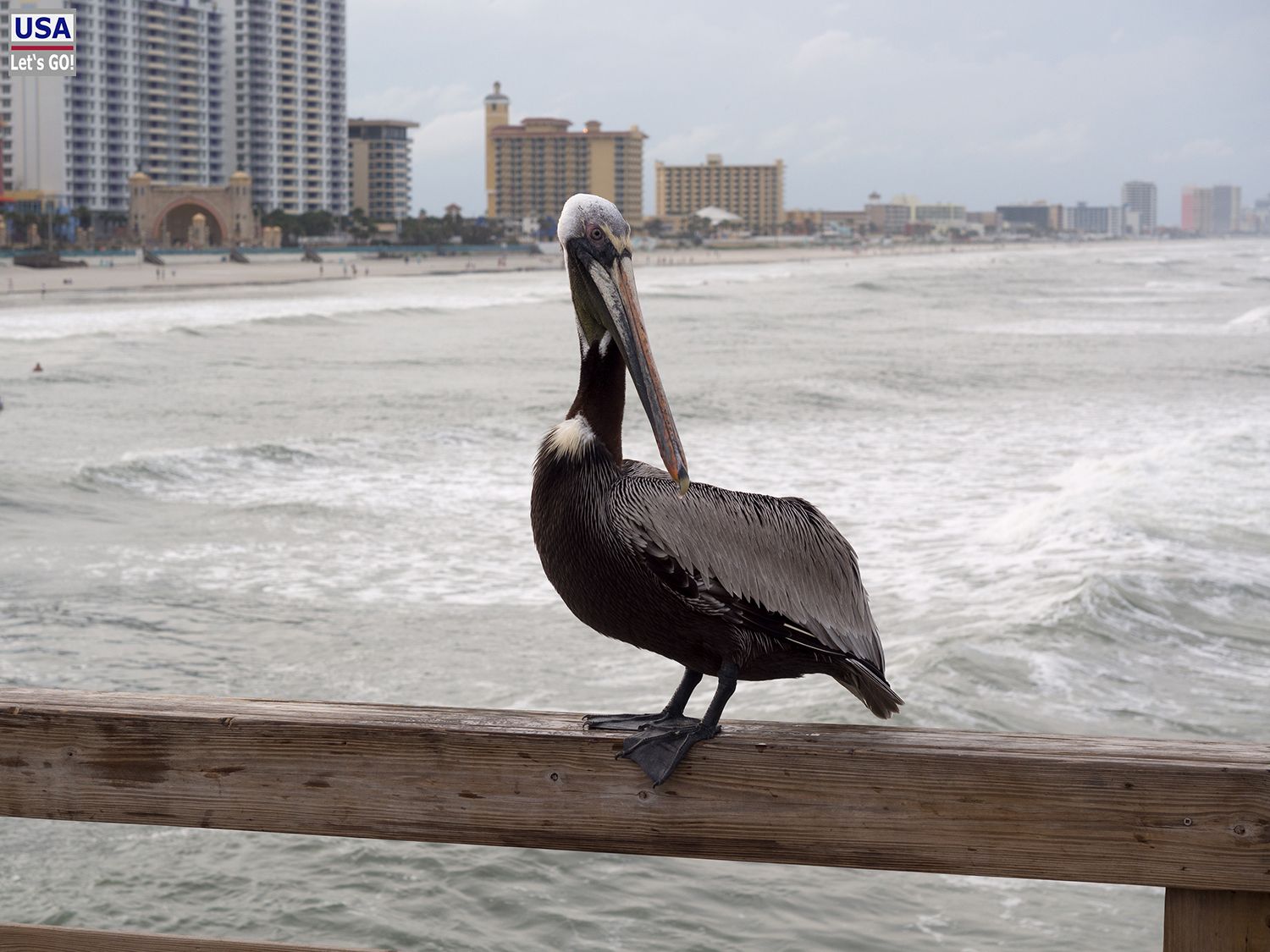 Ein großer Pelikan unterhält eine Gruppe einheimischer Angler und viele Touristen. Er ist beinahe wie ein Zirkustier dressiert. Dieser hier sitzt einfach nur geduldig auf dem Geländer und genießt das Leben.