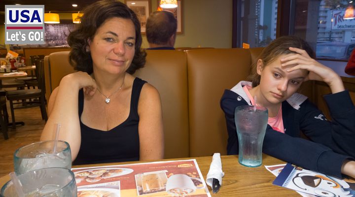 Allmählich macht sich allseits gewaltiger Hunger breit. Das Navi zeigt diverse Restaurants in der näheren Umgebung an, aber entweder sind die Kinder von unseren Vorschlägen (Italiener) nicht begeistert oder aber wir Erwachsene haben keine Lust auf Experimente. So landen wir am Ende doch wieder bei Altbekanntem: Denny`s. Da waren wir schon so oft, aber wir sind noch nie enttäuscht rausgegangen. Die Kinder lieben die Mac&Cheese.