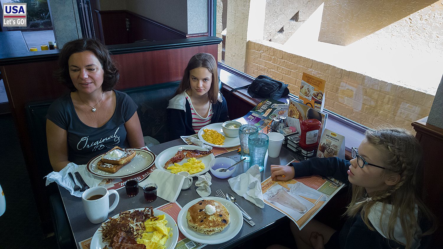 Gut gelaunt marschieren wir rüber zum Frühstück. Und zwar bei Denny´s direkt auf dem gleichen Grundstück wie das Days Inn. Leeeeecker! Und es reicht erstmal für mindestens drei Tage. Ich haue rein wie nichts Gutes und verdränge die Frage, wie man so viel und überhaupt so etwas schon direkt nach dem Aufstehen essen kann. Klappt gut.