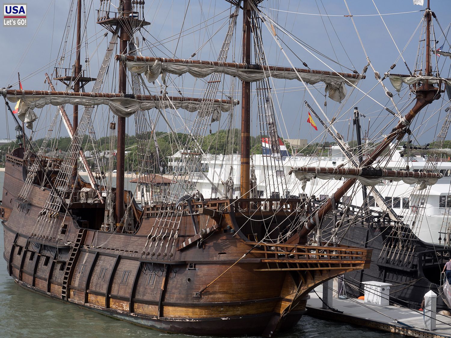 Wir möchten zum Anastasia SP, machen aber vorher noch einen kurzen Stopp bei der Bridge of Lions, die St. Augustine mit Anastasia Island verbindet. Hier liegen zwei historische Schiffe mit Namen El Galeón und Nao Victoria vor Anker. Ein schönes Motiv vor einem Himmel, der zur landeinwärts gelegenen Seite mittlerweile nach Wolkenbruch aussieht, während über dem Ozean die Sonne strahlt.