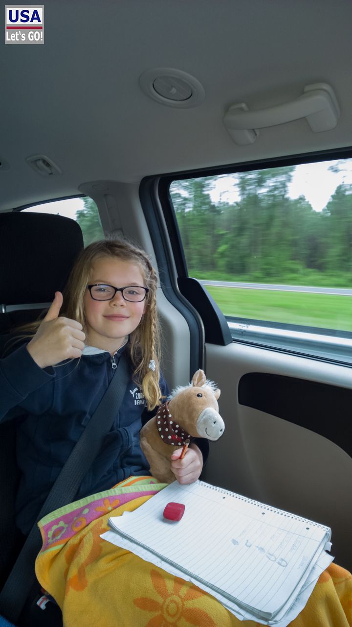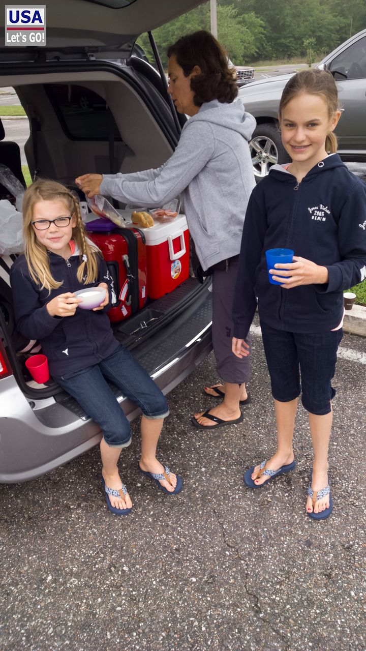 Wir verlassen Jacksonville Richtung Norden und nehmen Kurs auf Georgia. Der Okefenokee Swamp ist unser nächstes Ziel. Unterwegs halten wir bei einem Supermarkt und dann wird auf dem Parkplatz gefrühstückt. Nach diesem Boxenstopp ist die Stimmung auf den billigen Plätzen prächtig, wie man sieht.