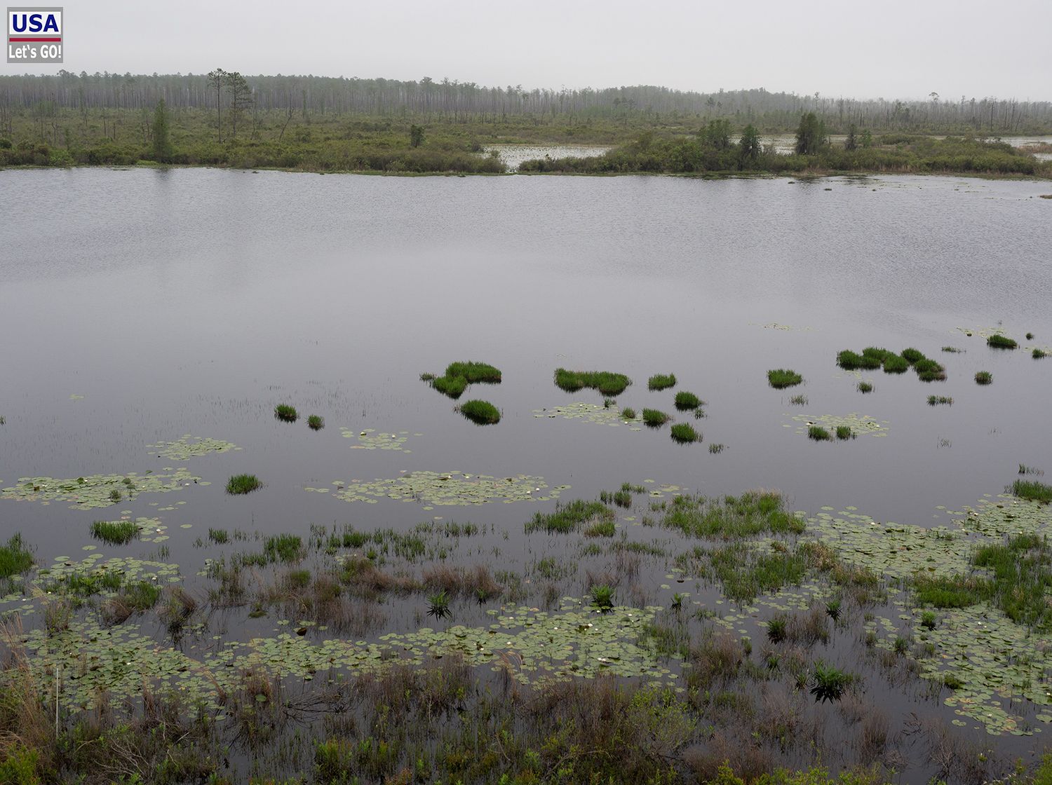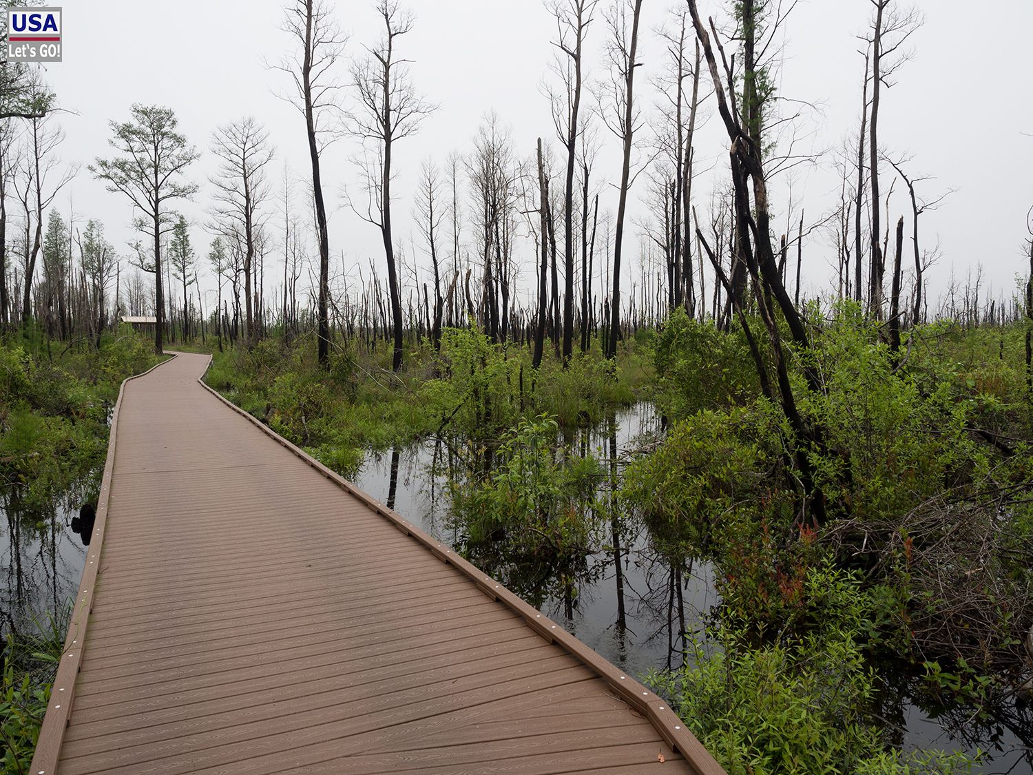Irgendwann reißen wir uns los und fahren ein paar Meter weiter zum Parkplatz, von wo aus der Chesser Boardwalk Trail losgeht. Dieser führt mitten durch den Sumpf und vermittelt einen hautnahen Eindruck von der außergewöhnlichen bizarren Landschaft.