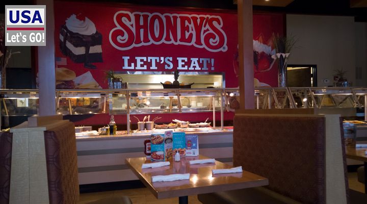 Shoney´s ist ein typisches family diner. Ganz auf Südstaatenküche (homemade southern inspired) spezialisiert gibt es Buffet mit regionalen Spezialitäten: peach cobbler (ein Pfirsich-Auflauf, der aber als Hauptgericht durchgeht), Grünkohl, corn bread mit stuffing, Schnibbelbohnengemüse, sweat potatoes (quietschsüß), mashed potatoes, turkey breast, breakfast ham. Vor allem das Grünkohlgemüse (wenn es denn Grühkohl) war, ist ausgezeichnet. Auch die anderen Gerichte sind lecker und gut gemacht.