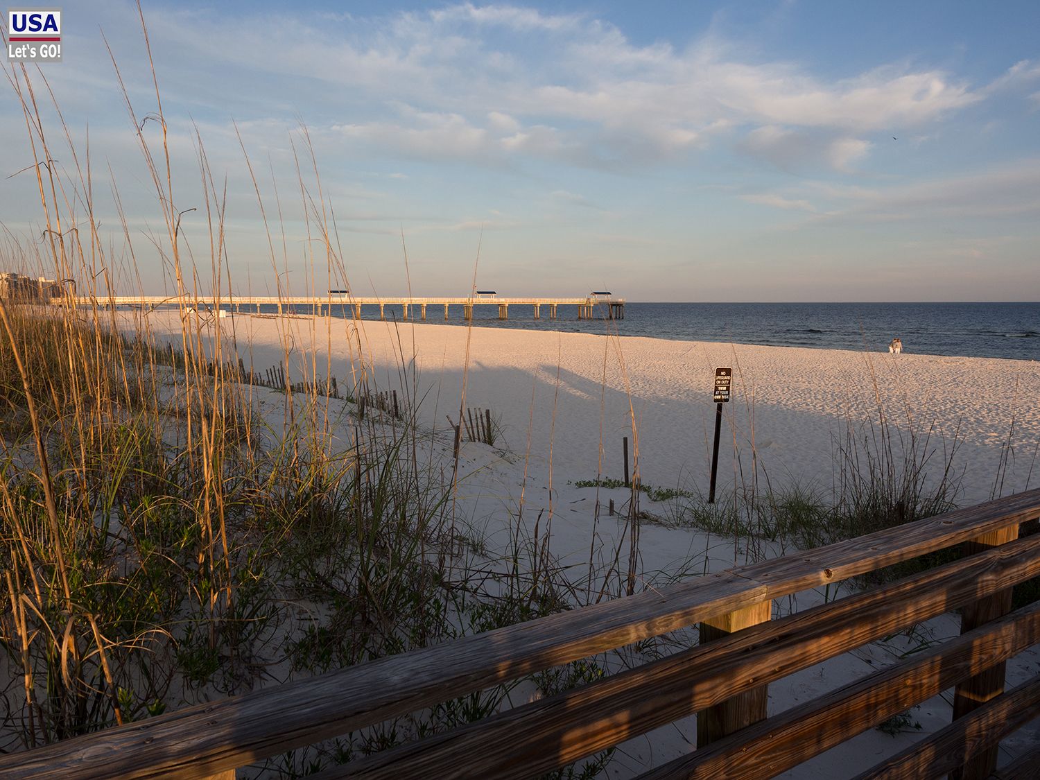Der Süden von Alabama gefällt uns gut. Die in das weiche Licht der tiefstehenden Sonne getauchte Landschaft ist sehr grün und gar nicht langweilig. Immer wieder kommen wir an weiten plantagenartigen Feldern und vielen Wiesen und Weiden mit in der Blüte stehenden Bäumen vorbei. In Alberta zweigen wir nach Süden zur Küste ab und kommen nach Orange Beach.