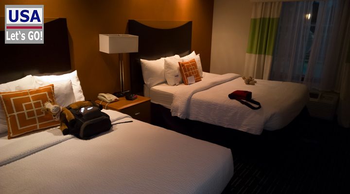 Wir fragen bei einem schick aussehenden Hotel direkt am Strand nach und bekommen mit 160 USD plus Tax eine herbe Abfuhr. Am Ende landen wir im Fairfield Inn & Suites für 89 USD plus Tax. Das Hotel macht einen hervorragenden Eindruck und als wir unser modern und stilvoll eingerichtetes behindertengerechtes Zimmer betreten, freuen wir uns über unsere Geduld bei der Übernachtungssuche (s. Bild unten links).