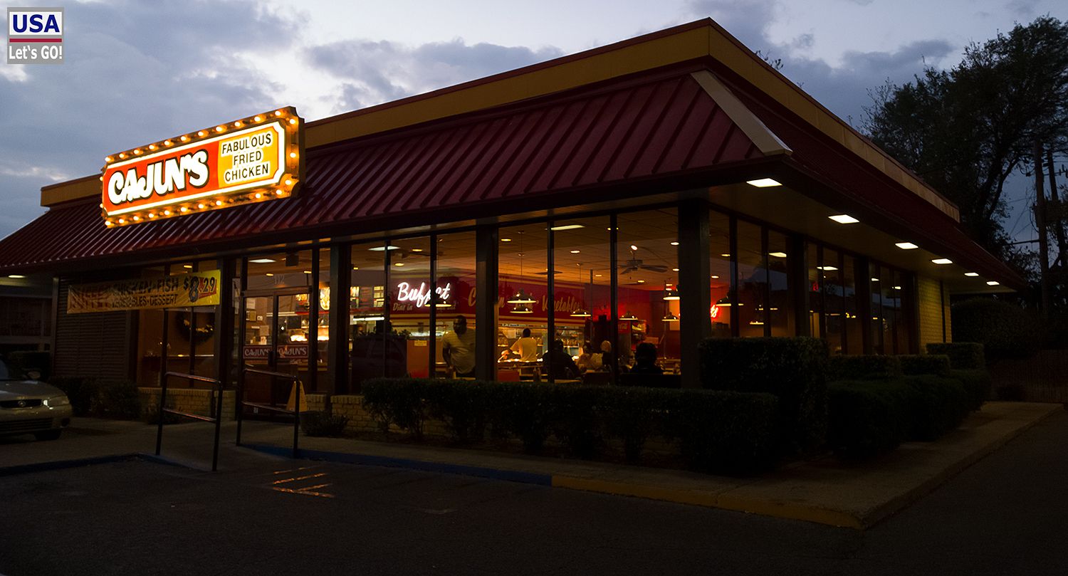 Doch gegen Abend meldet sich der Hunger. Da wir während der Fahrt nach Gulfport auffallende gelb-rote Schilder gesehen haben, die auf ein Cajun Buffet hindeuten, wollen wir das ausprobieren. Da sage noch einer Werbung sei für die Katz, bei uns funktioniert sie offenbar.