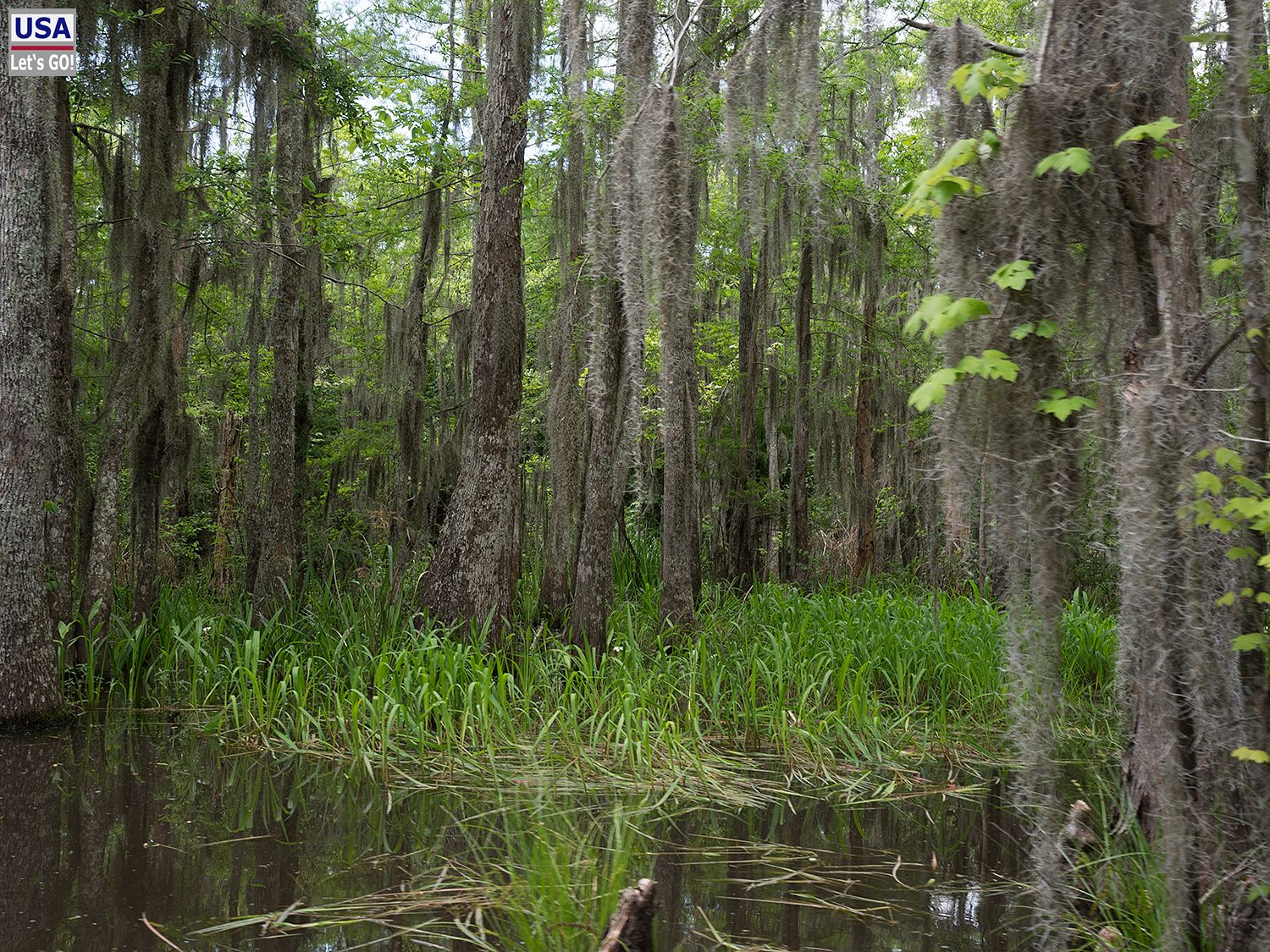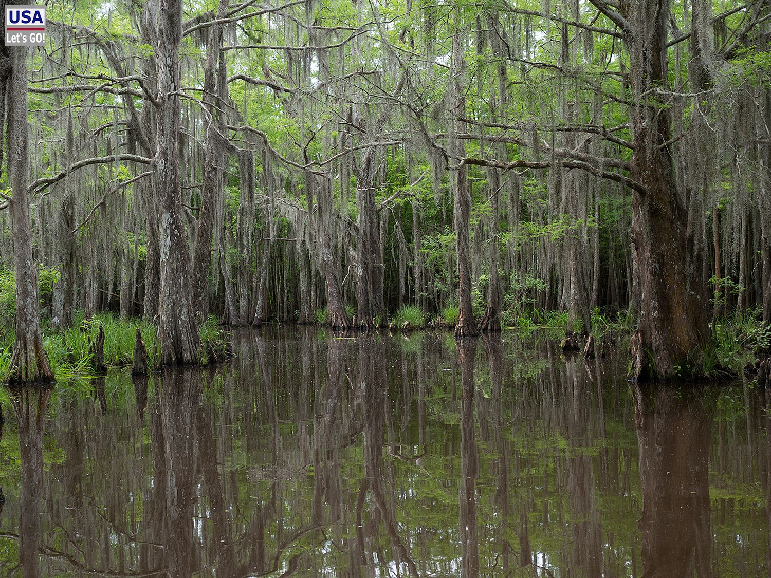 So hatte ich mir das vorgestellt: Der Honey Island Swamp wirkt ein wenig gespenstisch mit den sich im Wasser spiegelnden Bäumen.