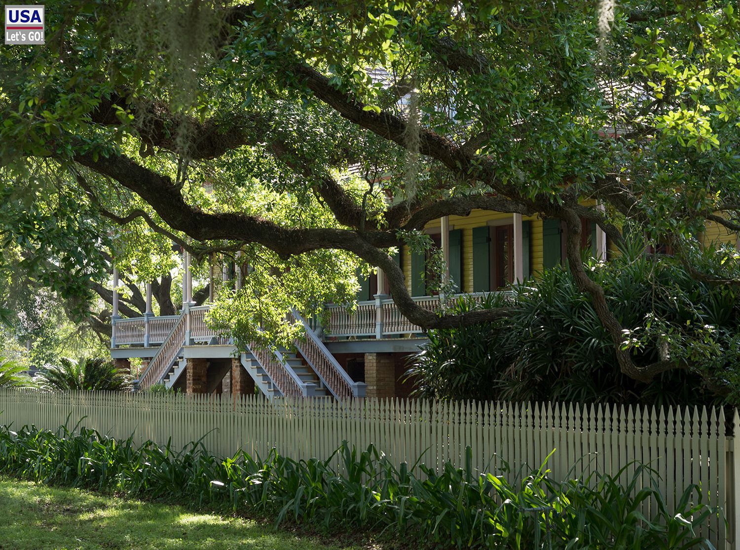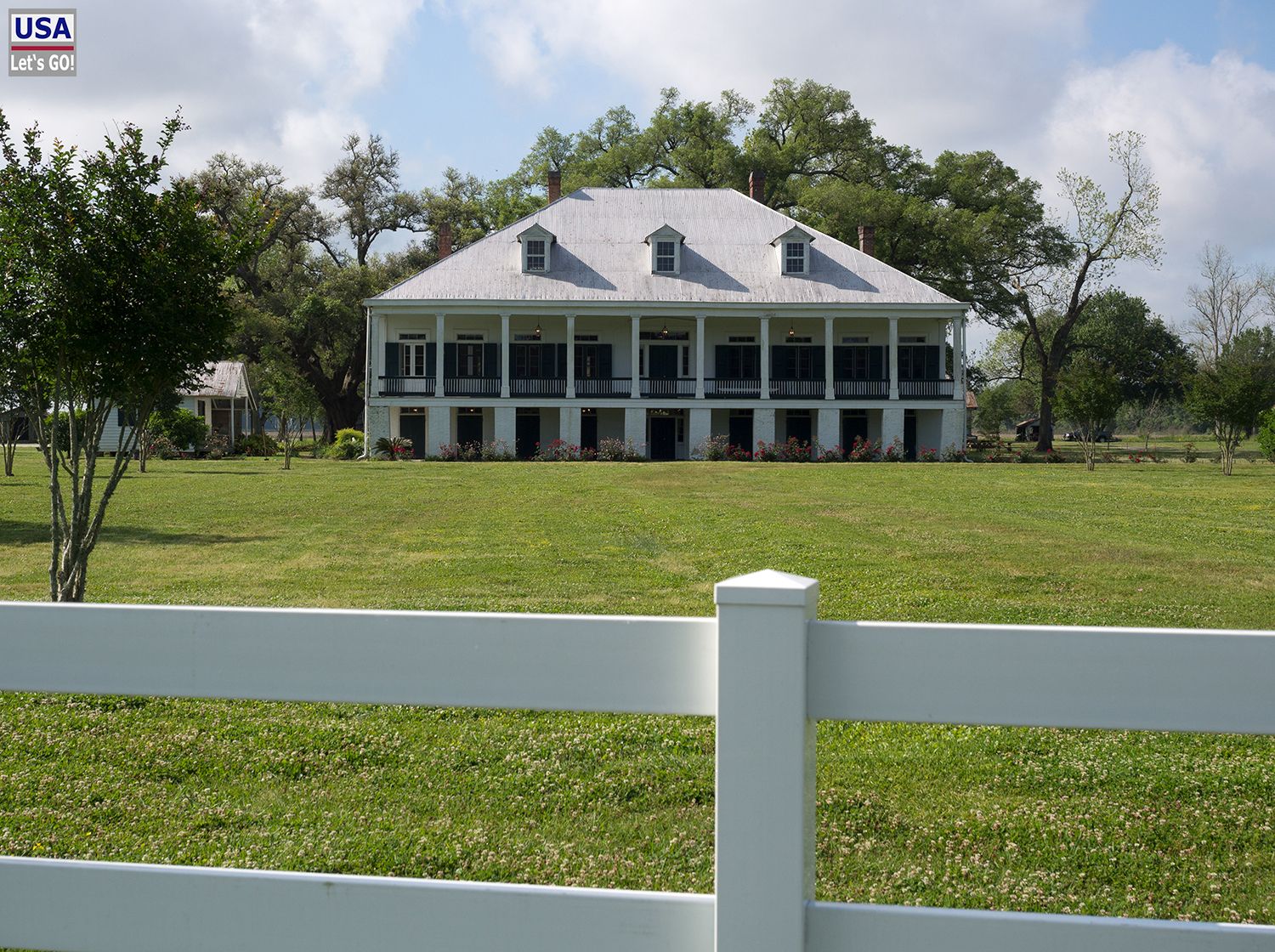Ein paar Meilen weiter die Straße runter, ebenfalls unmittelbar hinter dem Deich am Westufer des Mississippi, befindet sich die Laura Plantation. Für eine Tour haben wir keine Zeit, und von der Straße sieht man nur wenig, da sich die farbenfroh gestaltete Mansion hinter Bäumen verbirgt. Also gehe ich außen an der Grundstücksgrenze entlang über einen Acker und komme so wenigstens einigermaßen in Fotonähe des Gebäudes.