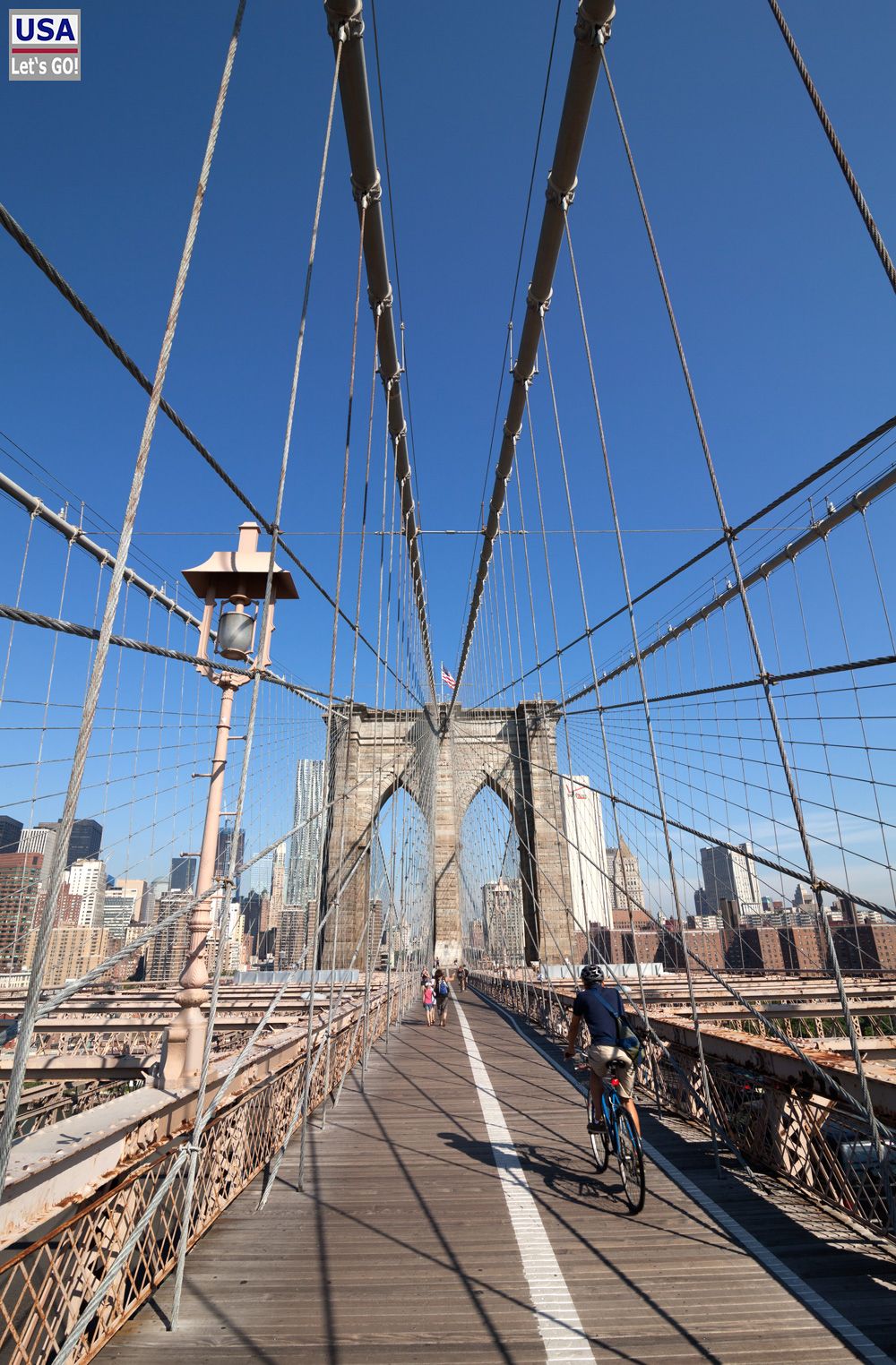 Stattdessen machen wir einen kurzen Spaziergang über die Brooklyn Bridge und kehren etwa auf halber Strecke wieder um. Der Anblick von Manhattan bei bestem Licht ist einfach fantastisch. Die Aufhängung der Brücke sieht aus wie das Netz einer riesigen Spinne.