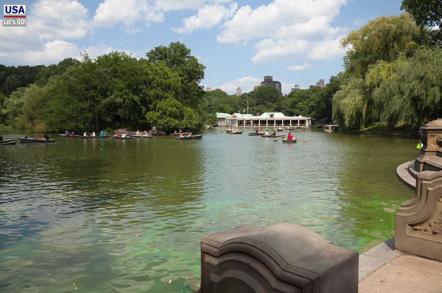 Wir erreichen die Bethesda Fountain & Terrace und kurz dahinter The Lake, die zweitgrößte künstliche Wasserfläche im Central Park. Das grünliche Wasser des Sees unter einem blau-weißen Himmel ist ein schönes Motiv.