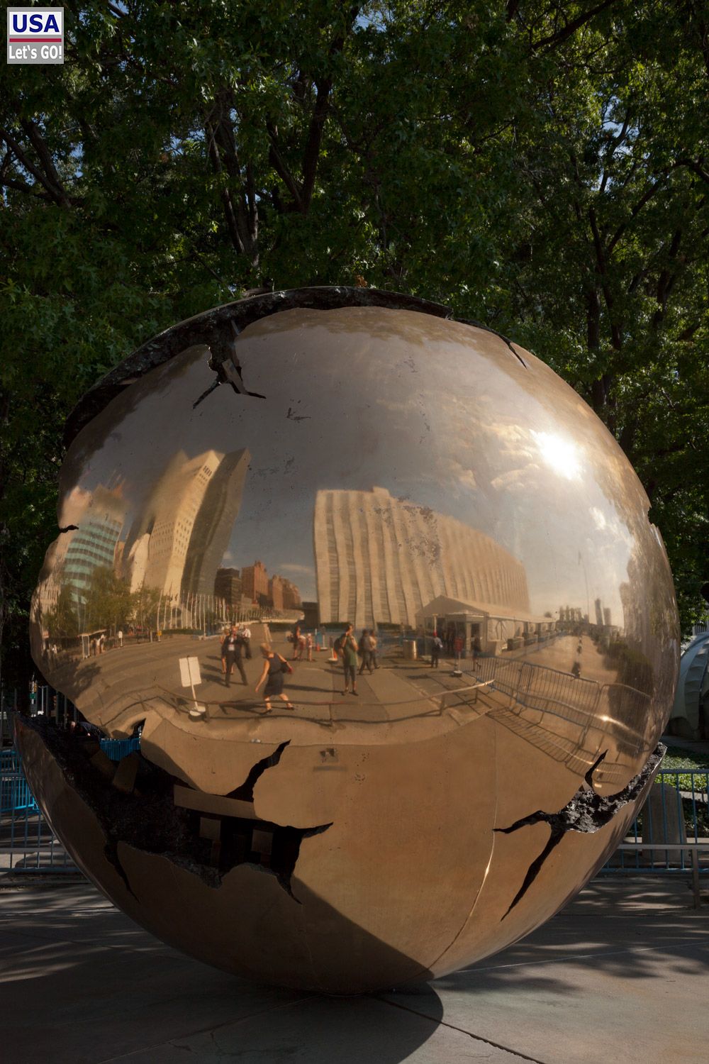 Wir fühlen uns fehl am Platz. Eine Führung findet in nächster Zeit nicht statt und ansonsten bleibt eigentlich nur der Blick auf die "Ahnen-Galerie" der Vereinten Nationen. Wir langweilen uns hier und möchten etwas Anderes erleben. Also nichts wie raus. Ein schönes Fotomotiv kommt mir noch vor die Linse, obwohl ich nicht weiß, was es symbolisieren soll. Vielleicht die Eine Welt, die allerdings unübersehbare Kratzer, Risse und Schrammen hat?