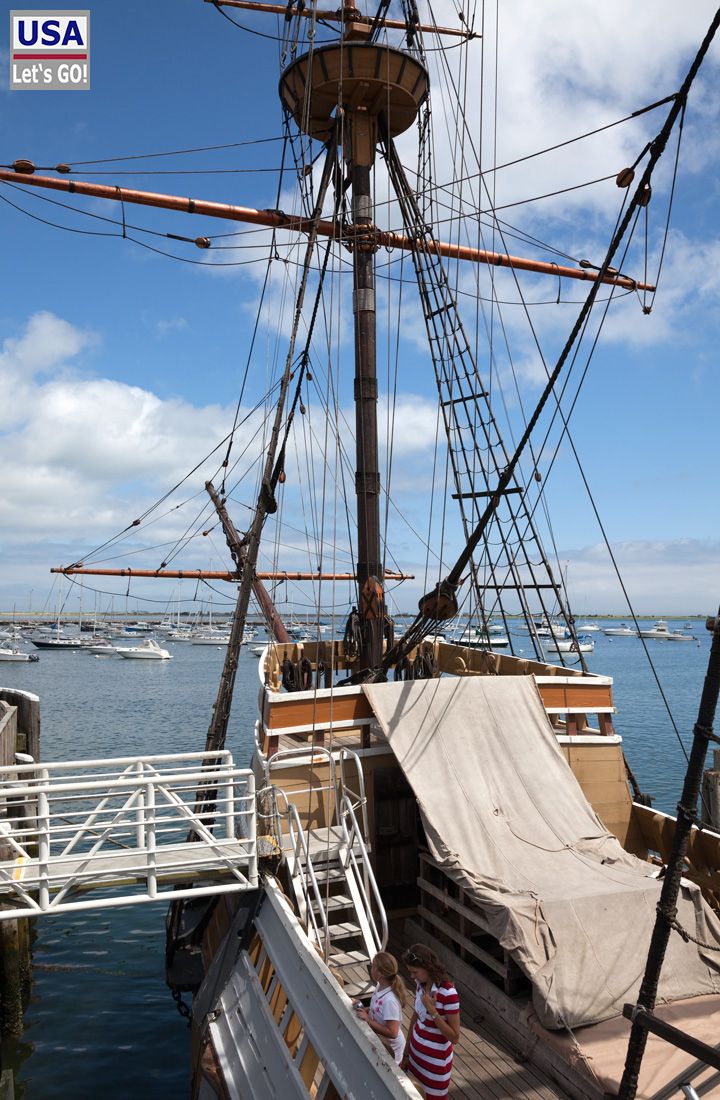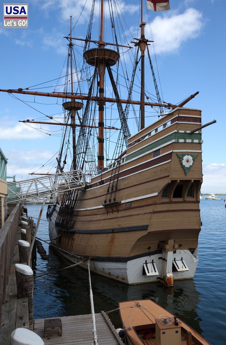 Der originalgetreue Nachbau der historischen Mayflower, mit der die Pilgrim Fathers und andere Abenteuer im Jahr 1620 die gewagte Reise über den Atlantik von England bis zur Ostküste Amerikas unternommen haben, steht unter Verwaltung der Plimouth Plantation.