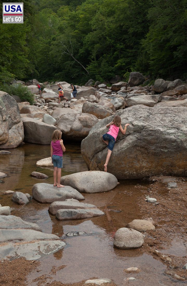 Weiter geht es über den Kancamagus Highway Richtung Westen. Dabei handelt es sich um einen landschaftlich sehr schönen scenic byway, der durch das Herz der White Mountains führt. Wir besuchen die Albany Covered Bridge, die Lower Falls Scenic Area (linkes Bild) und die Rocky Gorge (rechtes Bild).