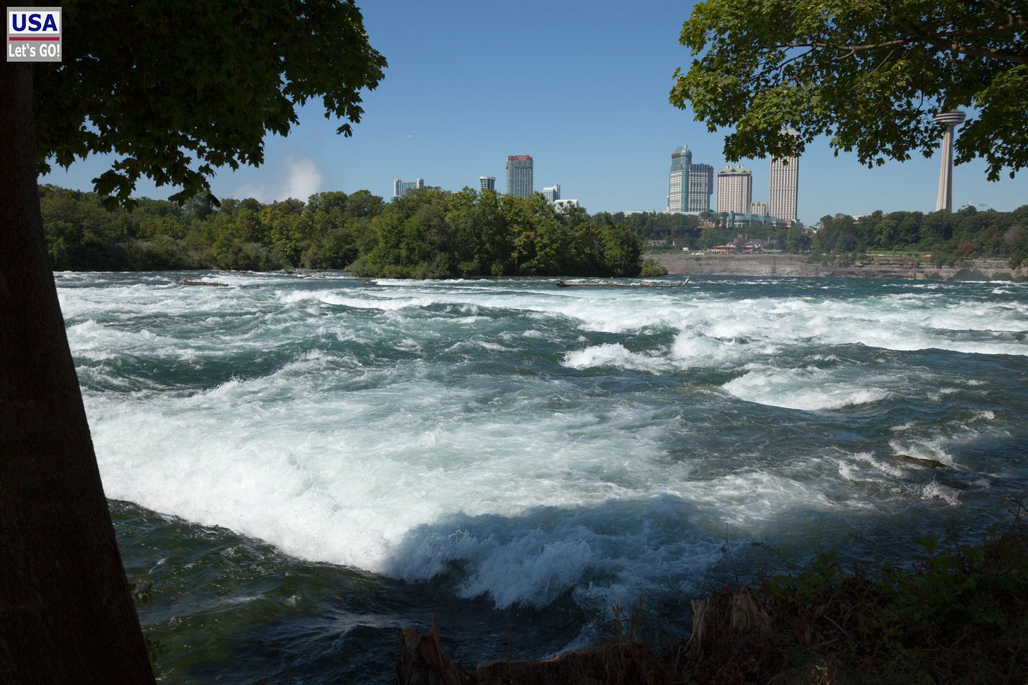 In einer Seitenstraße der Prospect Street finden wir einen kostenlosen Parkplatz. Das klappt ja bombig. Wir laufen entlang der rapids (Stromschnellen), die ein paar Hundert Meter weiter mit ohrenbetäubendem Getöse über die Klippen stürzen und dabei zu den größten Fällen der USA werden.