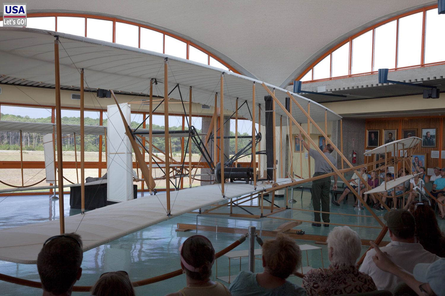 Wir betreten das große Visitor Center und platzen mitten in eine Präsentation. Ein schon etwas betagter Ranger erklärt einer relativ großen Besuchermenge technische Aspekte der ausgestellten Fluggeräte (z.B. die Kitty Hawk). Die Leute hängen an seinen Lippen. Keinen Mucks hört man im Auditorium. Der Mann ist voll in seinem Element und auch ich unterbreche meine Foto-Safari und höre aufmerksam zu. Da hat einer Spaß am Erklären. Klasse!