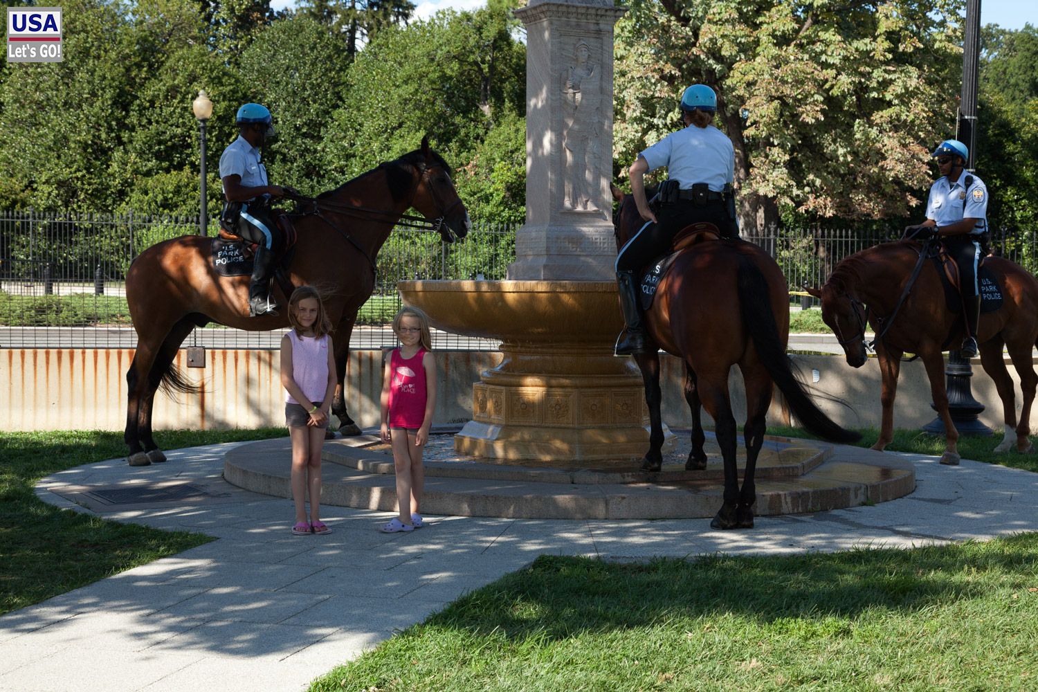 Annalena und Lisa-Marie sind begeistert, dass hier so viel berittene Polizei unterwegs ist.