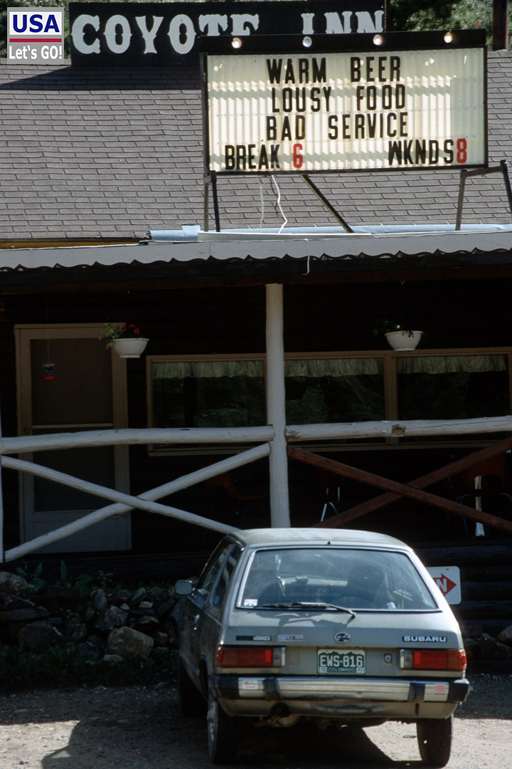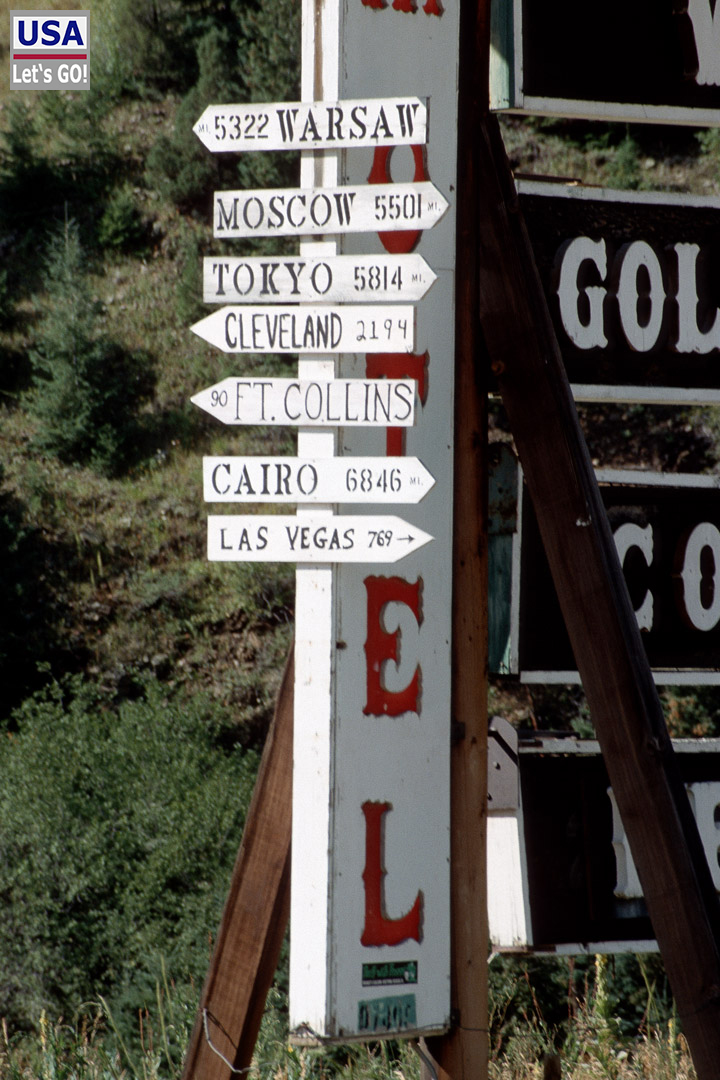 Am Dienstagmorgen (13.08.1991) fuhren wir schon ziemlich früh weiter Richtung Rocky Mountain Nationalpark. Irgendwo am Wegesrand gab es diese Lokalität mit interessanter Werbung und präzisen Richtungsangaben, damit ja keiner verlorengeht.