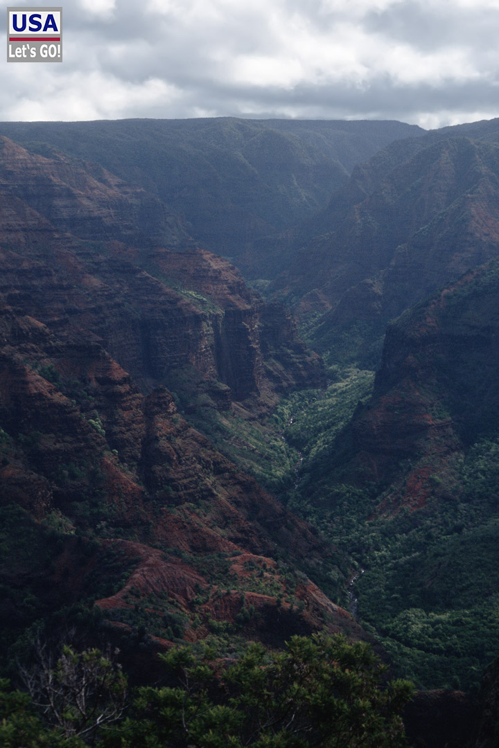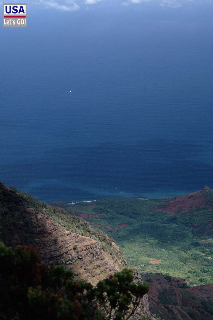 Morgens mussten wir feststellen, dass unser Brot nass geworden war in der Kühltasche. So mussten wir zunächst über die Holperpiste nach Waimea fahren, wo wir eine Bäckerei fanden und endlich frühstücken konnten. Dann fuhren wir in den Waimea Canyon. Vom Pu'u o Kila Lookout und vom Kalalau Lookout (s. Bild links) hatten wir einen herrlichen Blick auf den Pazifik und die Berge. Auch der Waimea Canyon Lookout war nicht von schlechten Eltern (s. Bild rechts).