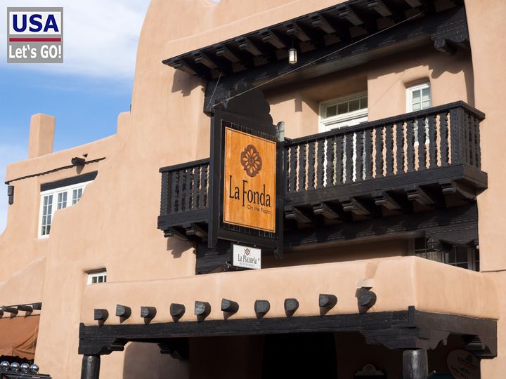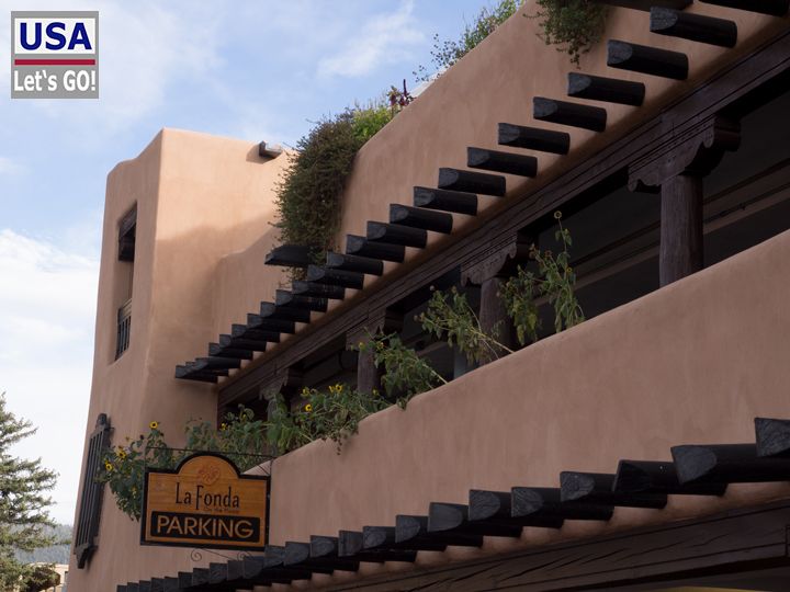 Der in Santa Fé allgegenwärtige Adobe-Baustil macht nicht einmal vor so profanen Dingen wie Parkhäusern (s. Bild links) halt. Von Hotels und Restaurants ganz zu schweigen (s. Bild rechts).
